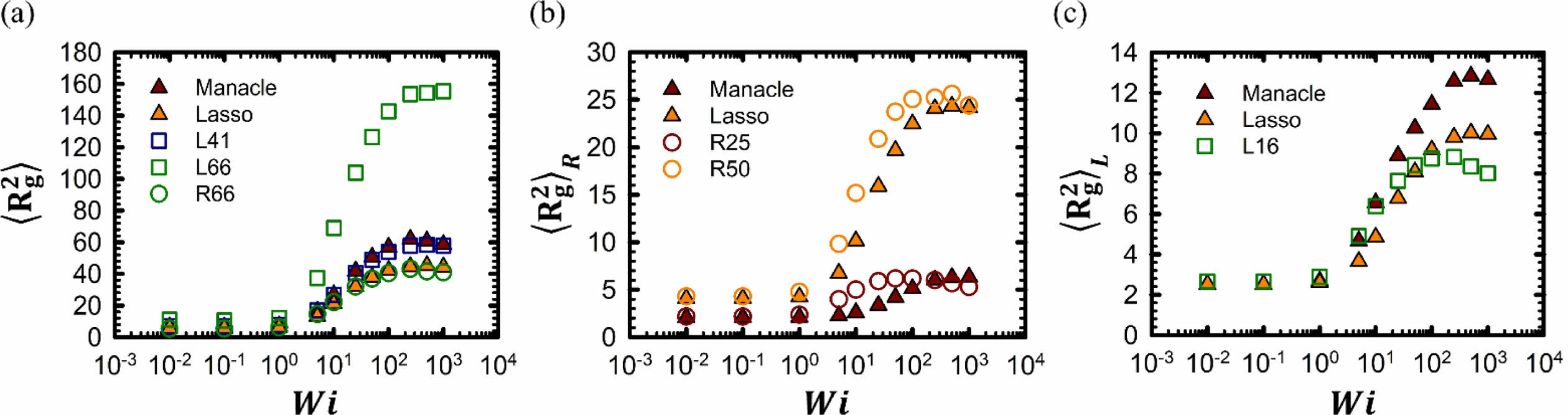 Figure 3(c)에서 보듯이, 각 고분자 체인의 선형 부분은 낮은 전단 유동 세기에서부터 중간 전단 유동 세기까지 상응하는 선형 고분자 체인(L16)과 거의 비슷한 증가 경향 및 값을 보여준다. 하지만, 높은 전단 유동 세기에서 각 고분자 체인의 선형 부분은 상응하는 선형 고분자 체인(L16)보다 높은 값을 가진다. 이는 올가미형 고분자 및 수갑형 고분자 체인의 선형 부분이 같은 전단 유동 세기에서 상응하는 선형 고분자 체인(L16)보다 평균적으로 더 늘어나 있다는 것을 의미한다. 특히, 수갑형 고분자 체인의 선형 부분은 올가미형 고분자 체인의 선형 부분보다 같은 전단 유동 세기에서 높은 값을 보여준다.
