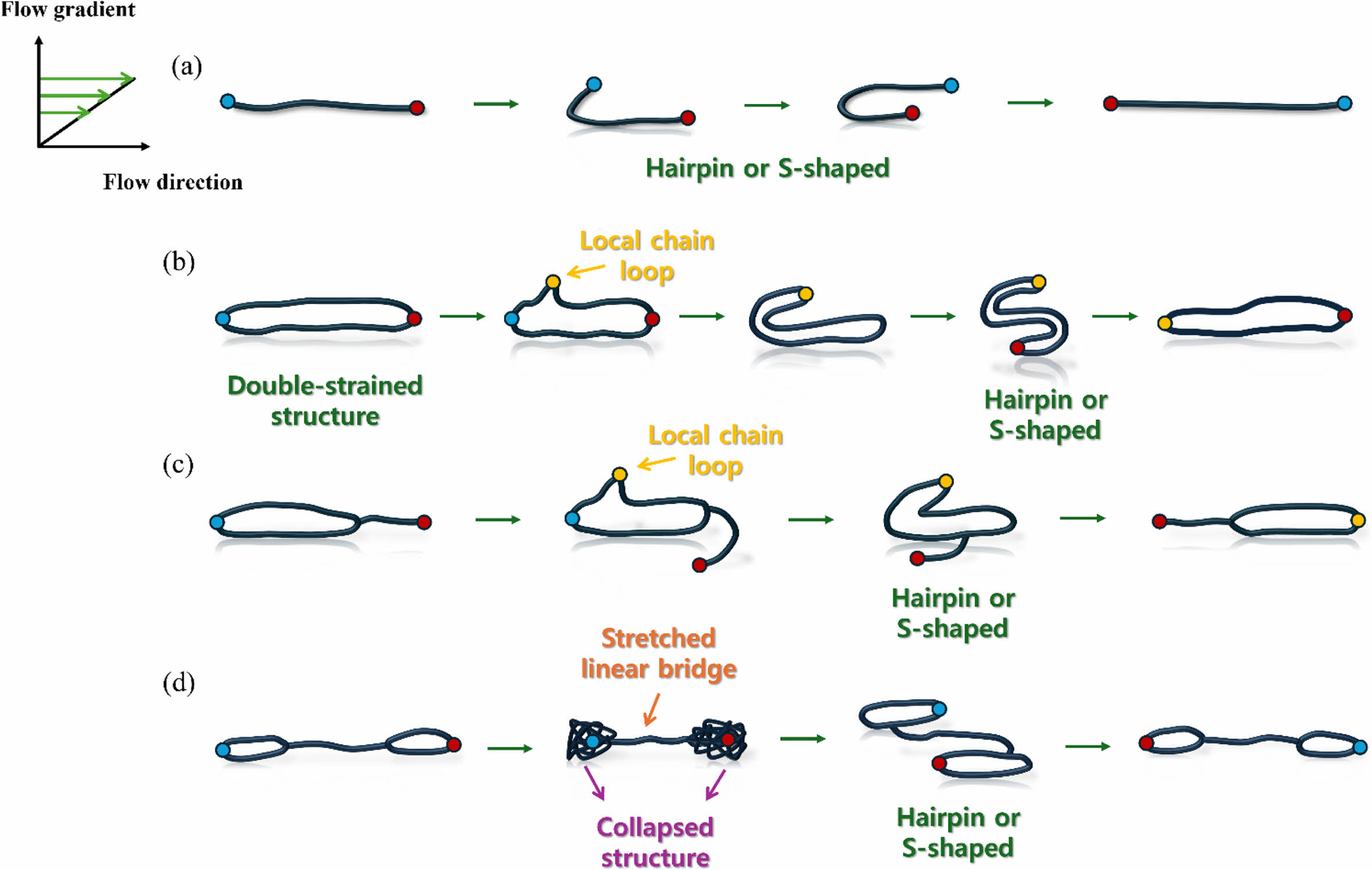 빠른 전단 유동 하에서 각 고분자 체인은 회전 및 텀블링 거동(chain rotation and tumbling behaviour)을 보여준다. Figure 4는 각 고분자 체인의 복잡한 회전 및 텀블링 거동을 간단히 도식화하여 시각적으로 표시하였다. 각 고분자 체인 회전 및 텀블링 거동에 대한 동영상 파일은 부록을 참조하길 바란다. 이전 고분자 용액에 대한 연구 결과와 마찬가지로, Figure 4(a)에서 보듯이, 선형 고분자 체인의 자유 말단(free chain end)이 랜덤하게 움직이다 전단 속도 기울기 차이에 의해 체인 회전 및 텀블링이 시작되게 되는 고분자 체인의 메인 윤곽선(main chain contour)을 따라 움직이므로 헤어핀(hairpin) 또는 S자 모양(S-shaped)으로 회전 및 텀블링 하게 된다.45-47 자유 배수 용액 하 고리형 고분자 체인은 분자간 또는 분자내 상화 작용(inter- or intra-molecular interactions)이 없기 때문에 빠른 전단 세기에서 고리형 체인의 각 사이드가 서로 접근하여 이중 가닥으로 이루어진 선형 체인 구조(double-stranded linear chain structure)를 만든다. 이중 가닥 구조를 형성한 고리형 고분자의 경우 회전 및 텀블링은 자유 말단(free chain ends) 대신에 속도구배(velocity gradient) 방향으로 올라오는 체인 로컬 루프(chain local loop)로부터 시작되게 된다. 단일 가닥 선형 고분자 체인(single stranded linear polymer chain)과 마찬가지로 이중 가닥 구조의 체인 로컬 루프는 고리형 고분자 체인의 중심 윤곽선을 따라 이동하게 되므로 전체적으로 헤어핀 또는 S자 모양의 회전 및 텀블링을 관찰할 수 있다.