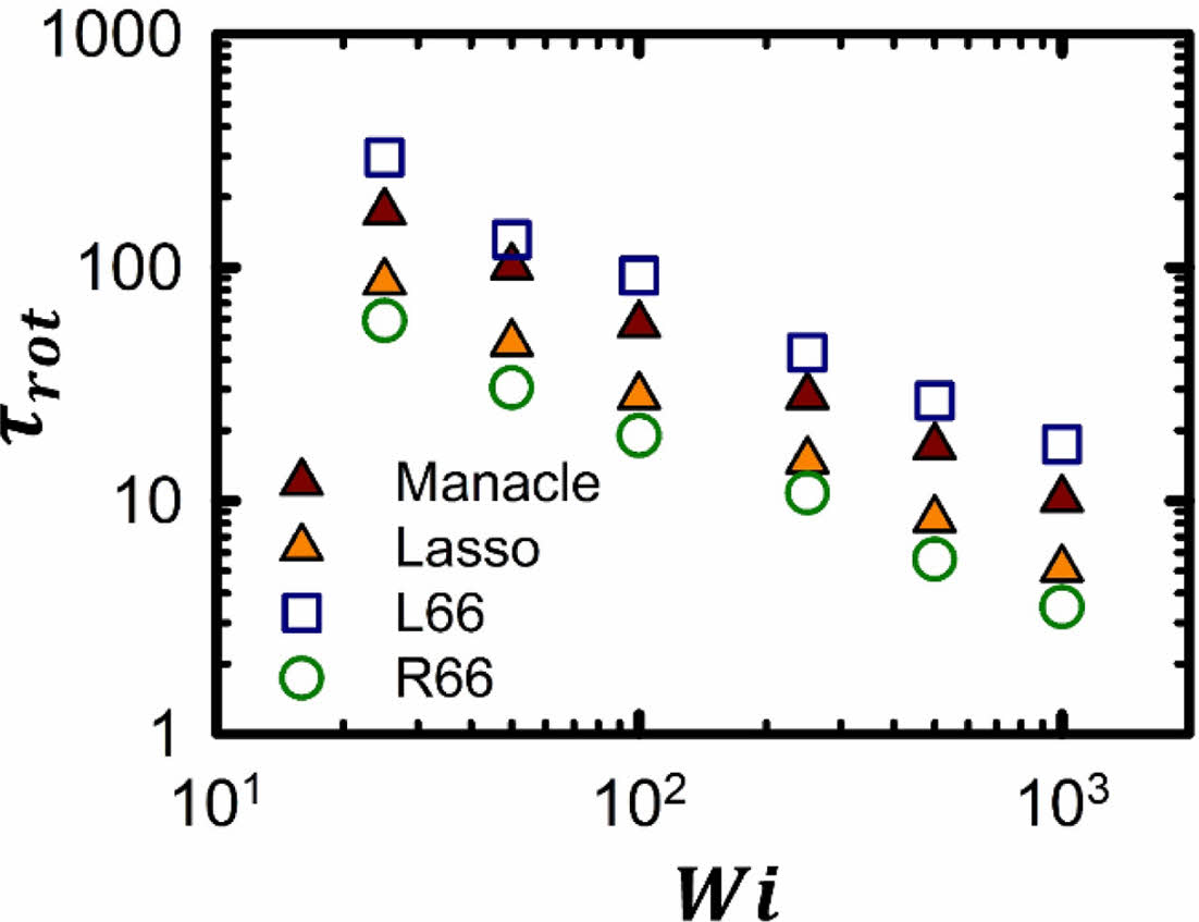 빠른 전단 유동 하에서 고분자 체인들은 회전 및 텀블링 거동을 하게 된다. 선형 고분자 체인은 자유 체인 끝에서 시작되는 전형적인 헤어핀 및 S자 모양 회전 및 텀블링 거동을 보여준다. 고리형 고분자 체인의 경우는 빠른 전단 유동에 의해 이중 가닥으로 이루어진 선형 체인 구조를 형성하게 된다. 이러한 구조로 인해 고리형 고분자 체인도 자유 체인 끝 대신에 체인 로컬 루프에서 시작되는 헤어핀 또는 S자 모양 회전 및 텀블링 거동을 보여준다. 올가미형 고분자 체인은 선형 곁가지 부분에 비해 고리형 부분의 비율이 크다. 따라서 올가미형 고분자 체인은 순수 고리형 체인과 비슷한 모습으로 헤어핀 또는 S자 모양 회전 및 텀블링 하게 된다. 올가미형 고분자 체인의 선형 곁가지 부분은 회전 및 텀블링 하는 동안 국소적인 흔들림(local wagging)을 보여준다. 수갑형 고분자 체인의 회전 및 텀블링 거동은 전체적으로 선형 고분자 체인의 헤어핀 및 S자 모양 회전 및 텀블링과 비슷하다고 볼 수 있다. 하지만, 수갑형 고분자 체인의 경우 자유 체인 끝을 가지고 있지 않다. 따라서 속도 구배 방향으로 올라간 양쪽 고리형 부분의 체인 로컬 루프로 인해 회전 및 텀블링이 시작된다. 속도 구배 방향으로 올라간 양쪽 고리형 부분은 각각 수축된 상태를 보여주며 선형 브릿지 부분을 스트레칭 시키게 된다. 각 고분자 체인에 대한 이러한 특징적인 회전 및 텀블링 메커니즘들은 각 고분자 체인에 대한 회전 시간 차이를 잘 설명해 줄 수 있다.