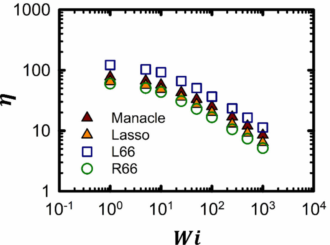 고분자 이론 및 실험 결과에 따르면 분자량이 증가함에 따라 고분자의 점도는 증가한다.9,10,13-15 하지만, 고리형 고분자의 경우 동일한 분자량을 가지는 선형 고분자보다 낮은 점도를 가진다고 알려져 있다.19-21 같은 전단 유동 세기에서 점도를 비교해 보면, 이러한 사실을 잘 확인할 수 있다. 동일한 전단 유동 세기에서 고리형 고분자(R66)는 선형 고분자(L66)보다 낮은 점도를 가지고 있고, 점도는 고리형 고분자(R66) < 올가미형 고분자 < 수갑형 고분자 < 선형 고분자(L66) 순으로 증가한다. 올가미형 고분자 체인의 경우 고리형 부분이 선형 부분보다 구조적으로나 동역학적으로 큰 역할을 하기 때문에 고리형 고분자와 비슷한 점도를 가질 것으로 예상된다. 수갑형 고분자의 고리형 부분은 선형 고분자의 자유 양쪽 끝과 비슷한 역할을 하며 전체적으로 선형 고분자 체인과 비슷하게 행동하기 때문에 선형 고분자와 비슷한 점도를 가질 것으로 생각된다.