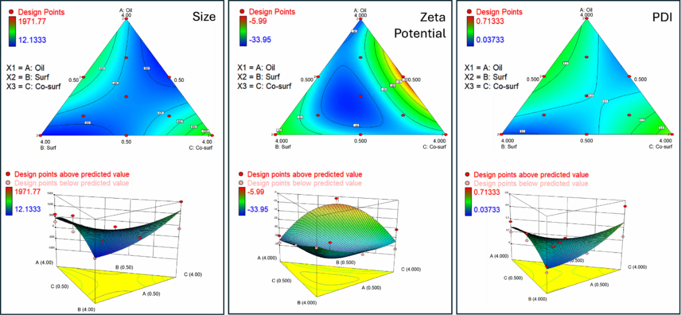 Figure 1 2D and 3D Ternary contour plots illustrating the effects of oil, surfactant, and co-surfactant ratios on particle size, zeta potential, and polydispersity index (PDI). |