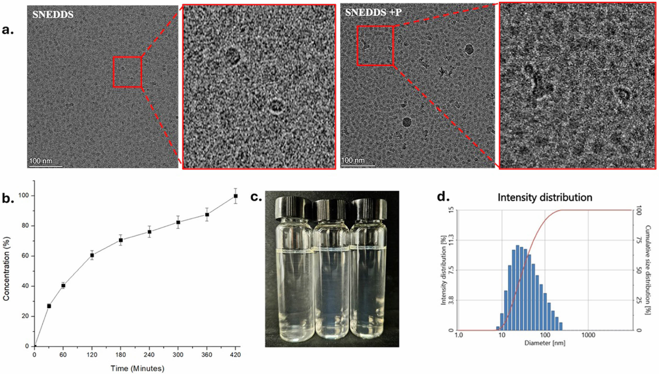 Figure 5 (a) Cryo-TEM images of SNEDDS and parsley-loaded SNEDDS, illustrating droplet morphology and size uniformity; (b) in vitro drug release profile of Parsley-SNEDDS; (c) visual appearance; (d) size intensity distribution of Parsley-SNEDDS after stability testing |