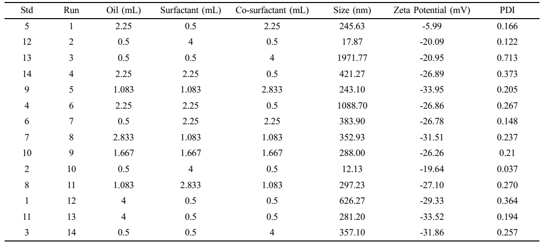 Experimental Design and Optimization of SNEDDS. For the optimization of the SNEDDS formulation, we employed the D-optimal design using Design-Expert software (version 8.0.6). Key parameters for optimization included particle size, zeta potential, and polydispersity index (PDI). The experimental formulations and their corresponding results are summarized in Table 1. Each formulation was prepared and characterized for particle size, zeta potential, and PDI using DLS. The resulting data were then input into Design-Expert for comprehensive analysis and optimization of the formulation.