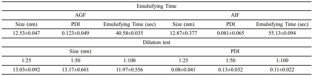 Endurance Test: The formulation that passed the freeze-thaw cycle test was subjected to an endurance test. Dilutions of the formulation were prepared at 25-, 50-, and 100-fold with deionized water. Changes in % transmittance, PDI, and particle size were then measured using DLS (Otsuka, Japan) to assess formulation stability.21