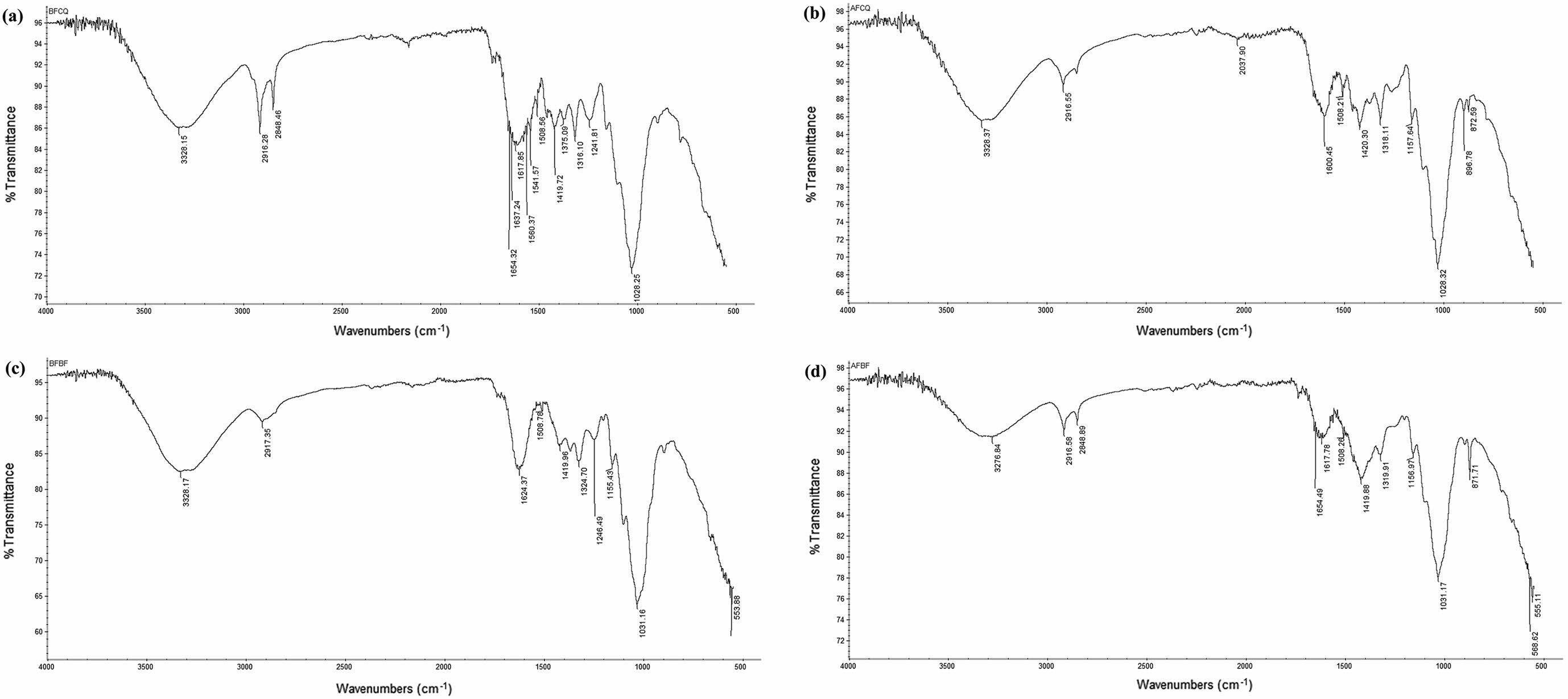 FTIR results of fibre treatments CQF: (a) before; (b) after BF; (c) before; (d) after