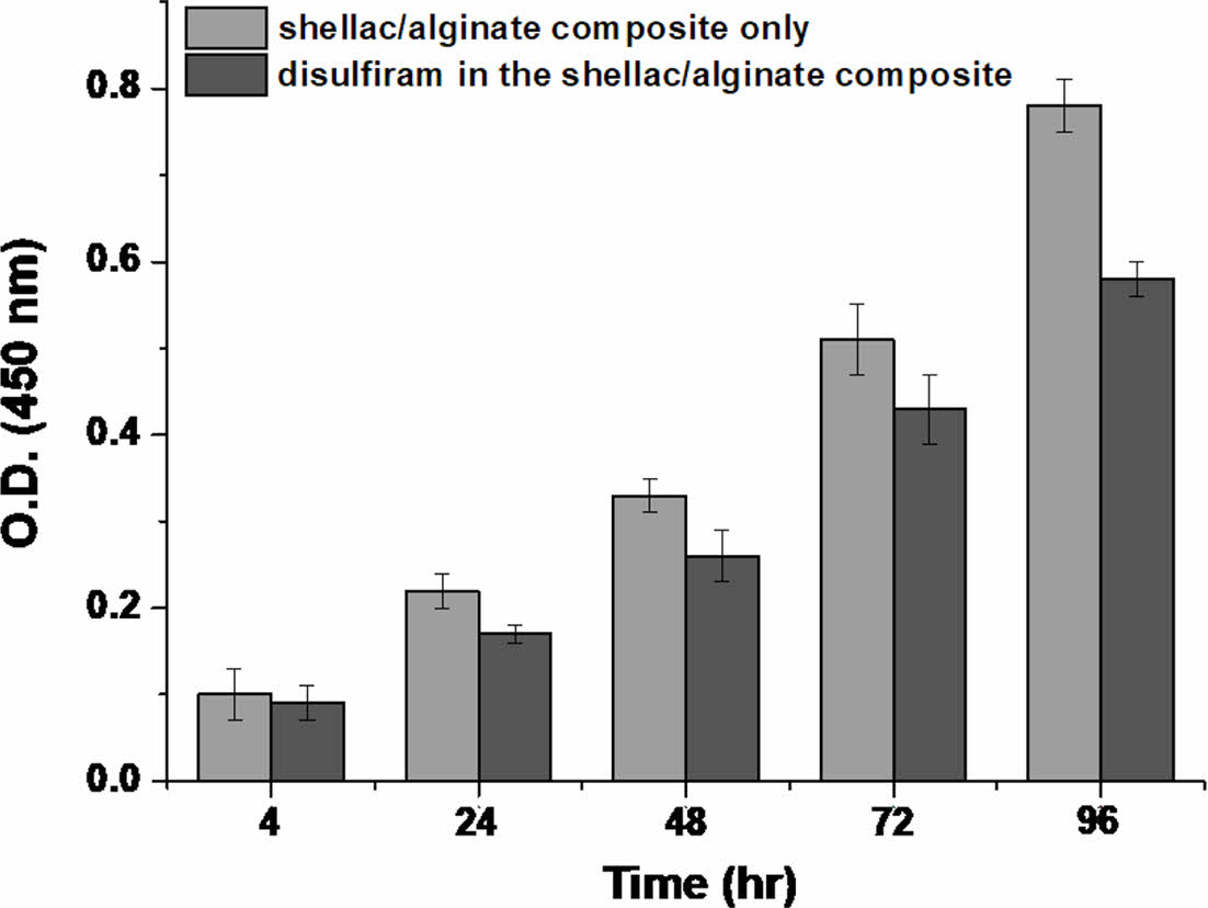 Differences in the cytotoxicity by disulfiram release from shellac/alginate composite film (n = 5).