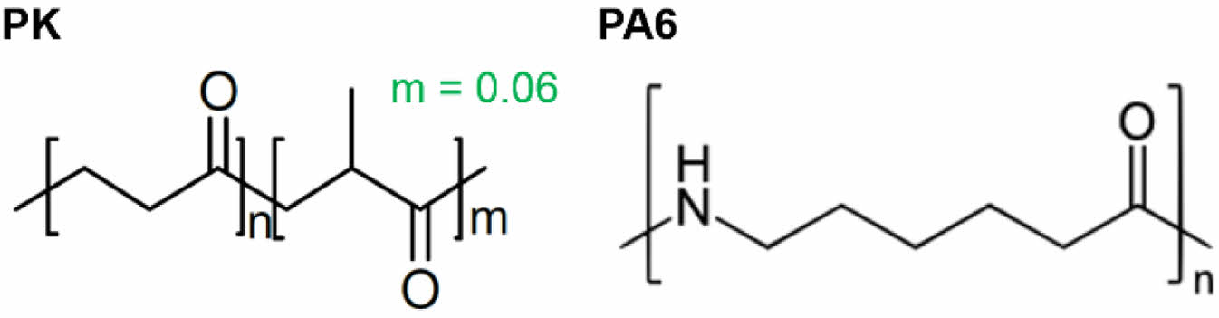 Chemical structures of PK and PA6. Mol fraction of PK: n = 0.94, m = 0.06.