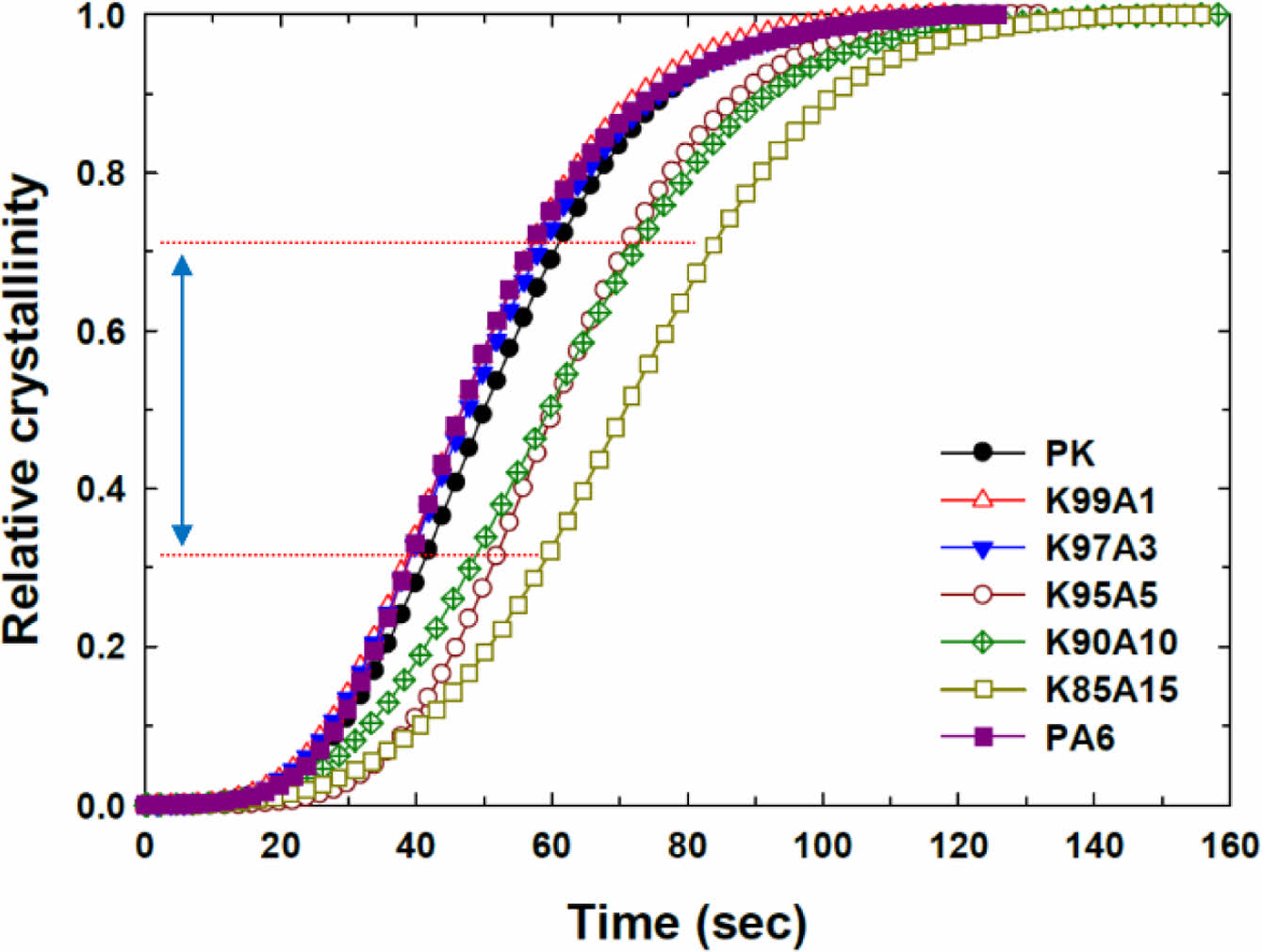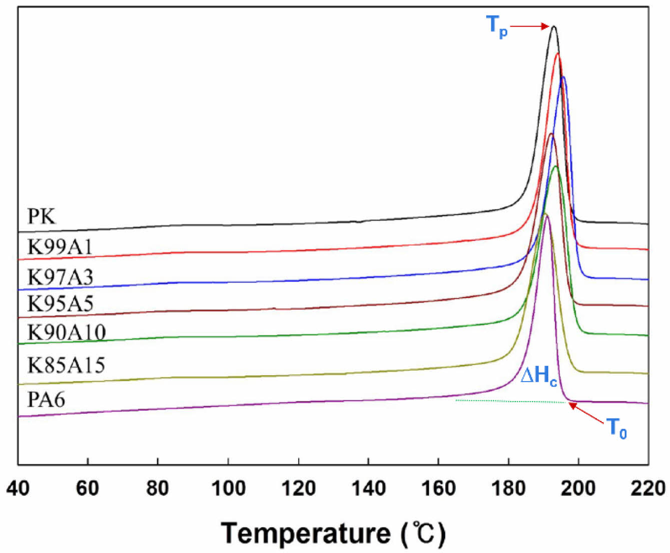 Polyamide 6 (PA6) was blended with polyketone (PK) to effectively control the crystallization rate. Depending on the amount of PA6 added, it can either retard or accelerate the crystallization of PK. This demonstrates that PA6 is an effective additive for fine-tuning the crystallization behavior of PK.