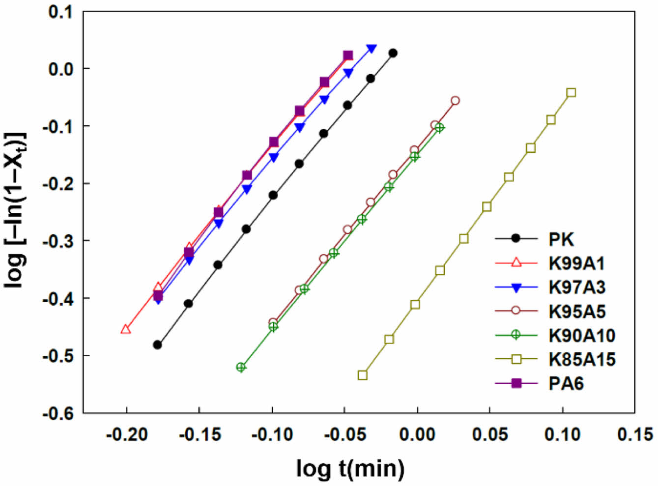 Modified Avrami plots for PK/PA6 blends, obtained by applying the modified Avrami equation to the linear range of the relative crystallinity curves shown in Figure 3.