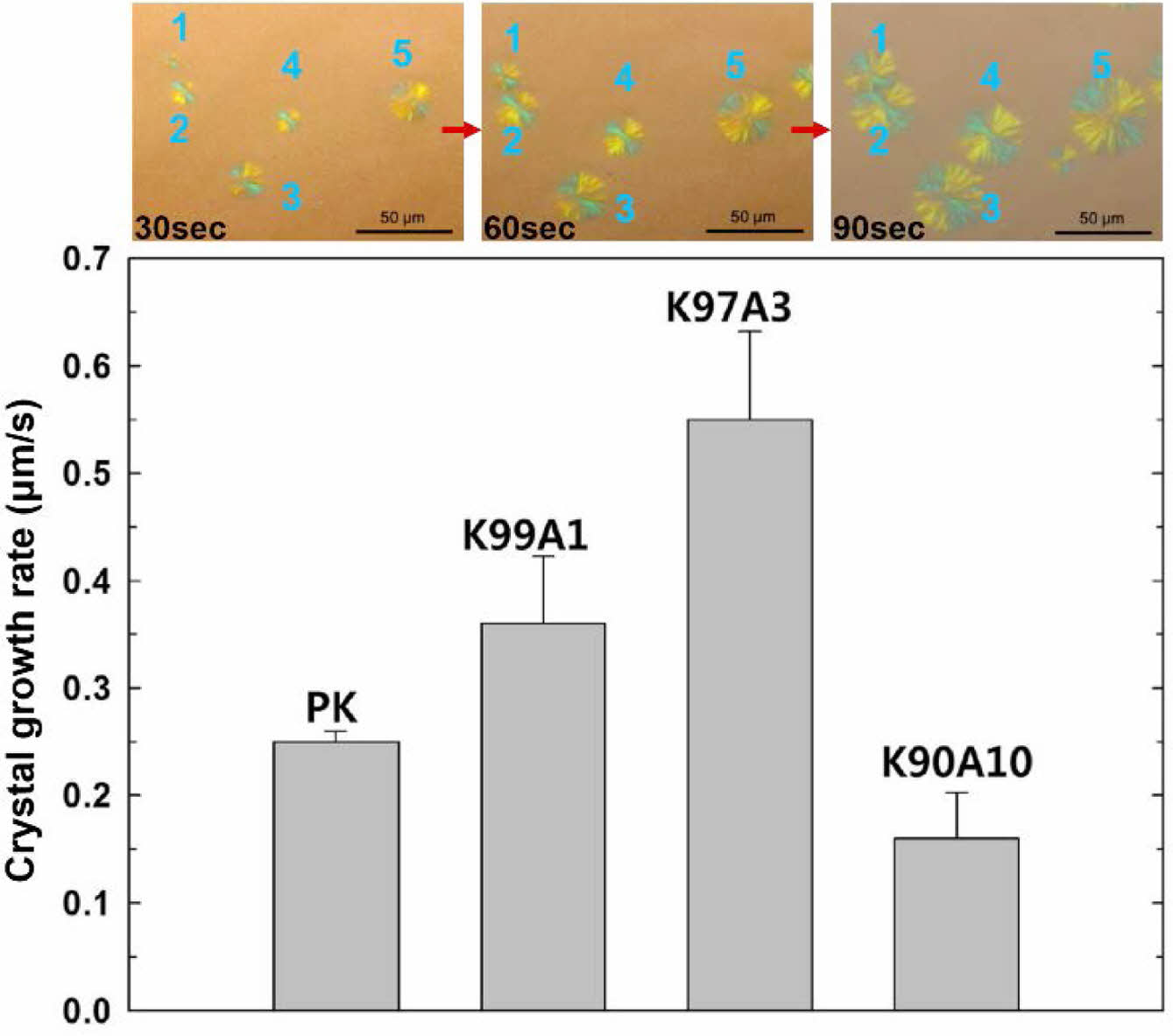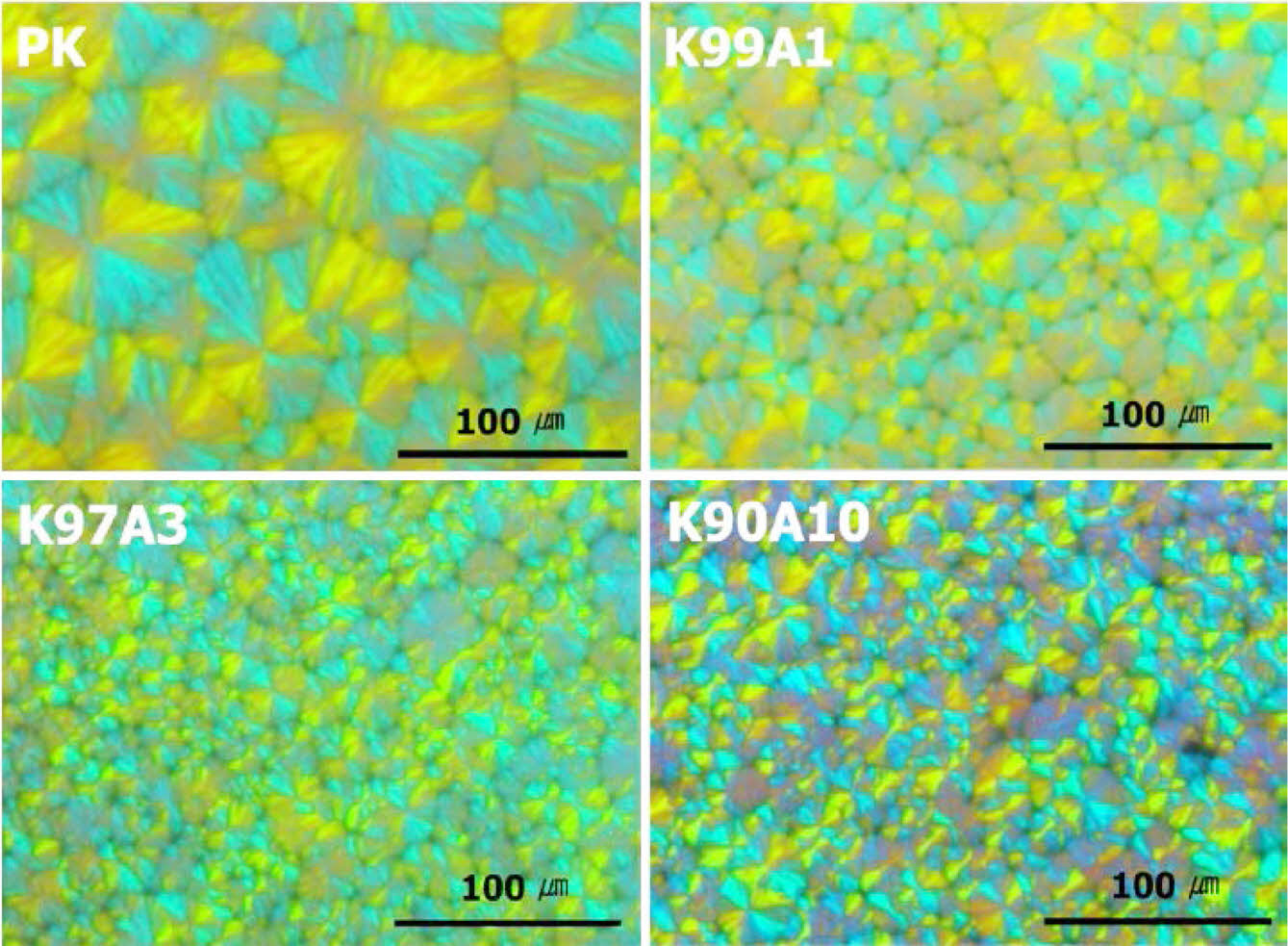 결정화 형태 분석. PK/PA6 블렌드의 결정 성장 속도에 대한 POM 분석 결과를 Figure 5에 나타내었다. 그림 상단에 neat PK의 결정 성장 과정을 예시로 나타내었으며, 예시와 같이 각 조성에 대해 임의로 선택한 5개의 spherulite를 대상으로 시간에 따른 결정 지름의 변화를 측정하고, 이를 평균하여 결정 성장 속도를 산출하였다. 그 결과, K99A1 및 K97A3 시편은 neat PK에 비해 빠른 결정 성장 속도를 보인 반면, K90A10 시편은 상대적으로 느린 성장 속도를 나타내었다. 이는 앞서 비등온 DSC 분석을 통해 확인된 결정화 경향성과 일치하는 결과로, PA6 첨가에 따른 결정화 특성이 POM 관찰을 통해서도 일관되게 검증되었음을 의미한다.