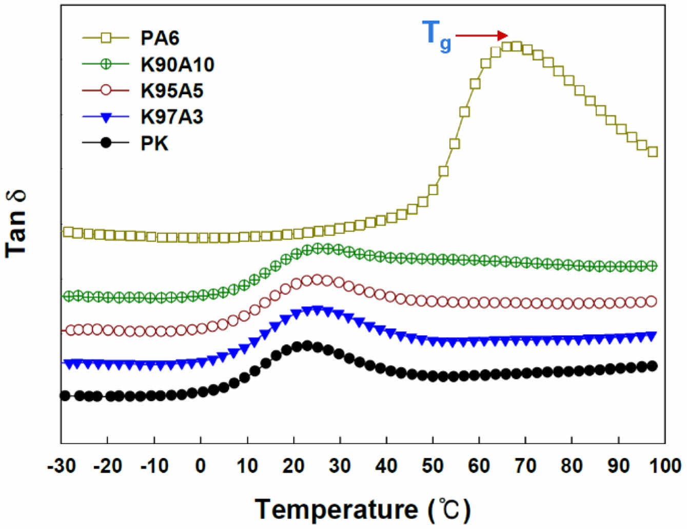 DMA curves of PK/PA6 blends showing Tan δ as a function of temperature.