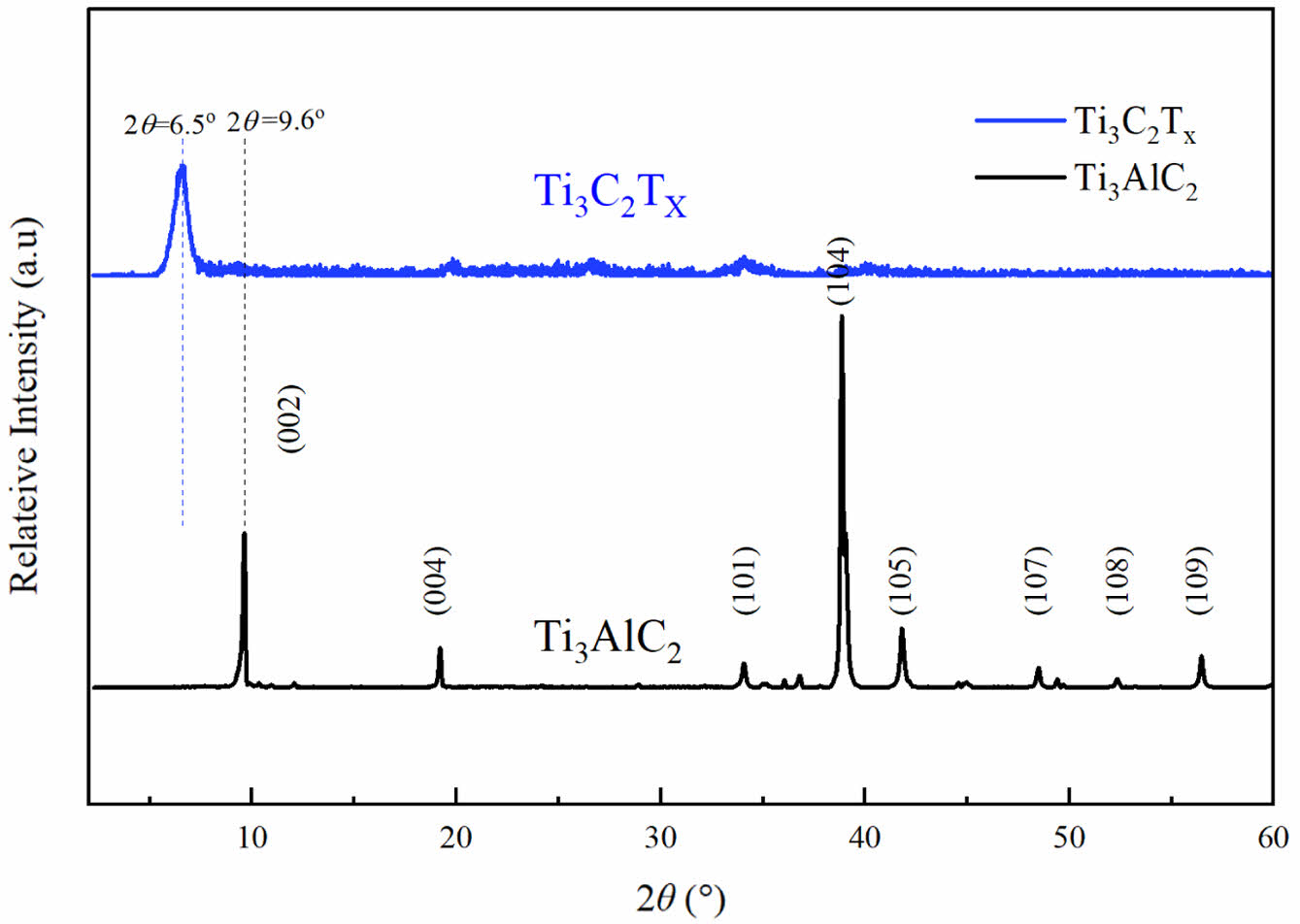 Characterization of MXenes. WAXD Measurement: WAXD was conducted to elucidate the structure and morphology of the Ti3C2Tx powder, as shown in Figure 1. After etching, the sharp (002) diffraction peak of the filler changes from 2θ = 9.6o to 2θ= 6.4o, indicating a significant increase in interlayer distance. Moreover, the peak at 2q= 38.9o refers to strongest (104) peak of Ti3AlC2 also disappears, which indicates that the Al layer has been removed, resulting in a transition from Ti3AlC2 to Ti3C2Tx.