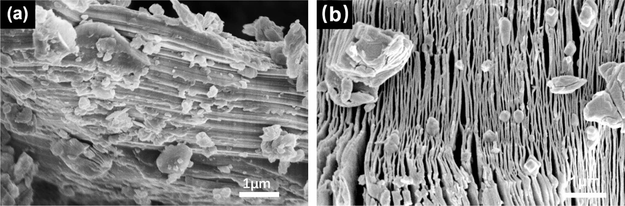 SEM Observation: The morphology of Ti3AlC2 and Ti3C2Tx was investigated using SEM as shown in Figure 2. Ti3AlC2 exhibits a tightly stacked dense layered structure, which is often seen in ternary carbides. After etching process, the thin layers of Ti3C2Tx are weakly stacked, and the interlayer distance increases, revealing accordion like morphology, which is in accord with the results of WAXD, which might be due to the exothermic reaction between HF and Al, resulting in the escape of gases such as H2 during the etching process.