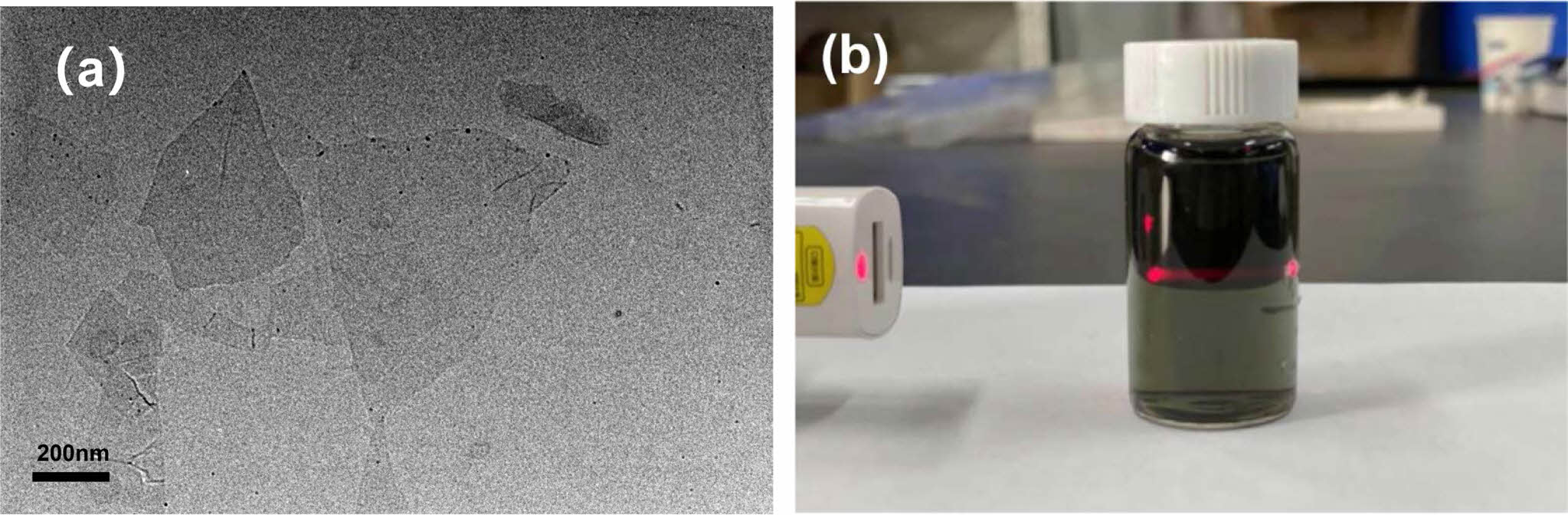Figure 3 (a) TEM image of Ti3C2Tx dispersed in distilled water; (b) digital photos of Ti3C2Tx dispersion. |