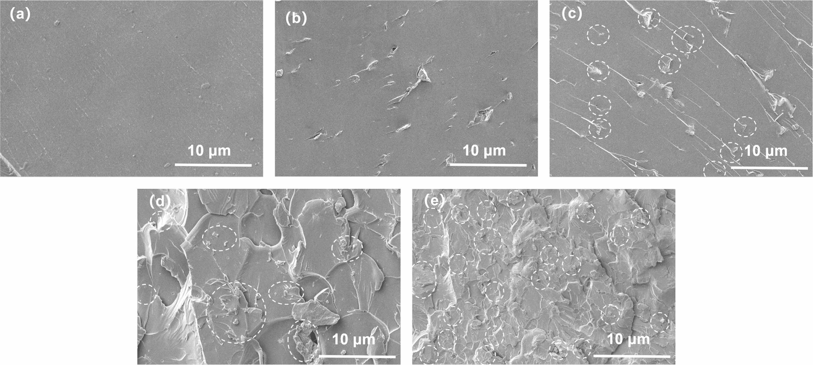 From Figure 4(a), it can be seen that the cross-section of pure EP is relatively flat. After adding 0.25 wt% MXenes, a few short cracks with a length of approximately 1-8 μm appeared on the cross-section of EP/MX0.25 in Figure 4(b), which might be evidence of MXene finely distributed in EP; For EP/MX0.5 in Figure 4(c), due to the increase in MXenes content, it can be seen that the number of cracks increases (as shown by the dotted circle in the figure), and their dispersion is relatively uniform, reflecting the good dispersion of MXenes in EP matrix. Interestingly, these cracks are connected to relatively long strip structures arranged parallel to each other. This might be cracks in the EP matrix caused by stress during fracturing; With the further increase of MXenes content (Figure 4(d)), the cross-section of EP becomes no longer flat, which might indicate that the addition of 0.75 wt% and more MXenes changed the fractured surface morphology of EP. The uniformity of the fractured morphology of EP is good, reflecting the good dispersion of MXene. The possible locations of MXene are also marked with dashed circles. It can be seen that the distribution of MXenes is relatively uniform. For EP/MX1 (Figure 4(e)), the cracks and grooves become smaller and have better uniformity. This might be due to the addition of higher content MXenes, which change the stress distribution and transmission during EP fracturing, leading to an increase in the regions involved in deformation and energy transmission. The possible locations of MXenes are also marked with dashed circles. Based on these positions and the uniformity of the cross-sectional morphology, it can be concluded that the dispersion of MXenes is good.