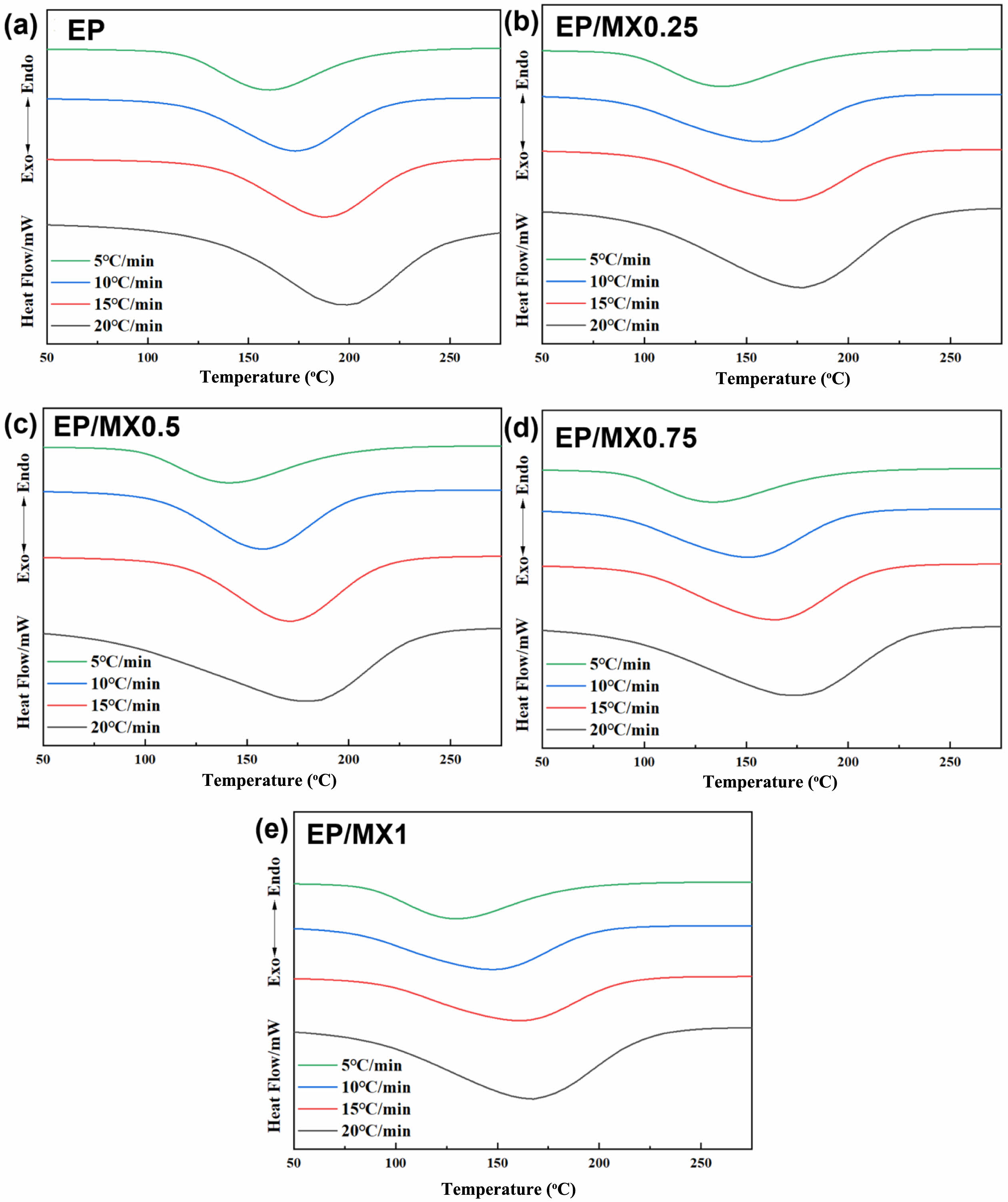 The DSC study was used to investigate the curing behavior of neat EP and EP/MXenes composites. Figure 5 shows DSC curves of EP and EP/MXenes composites at heating rates of 5-20 ℃/min. From this, the curing initial temperature (Ti), peak temperature of curing (Tp) and end temperature of curing (Te) of EP and EP/MXenes composites at different heating rates can also be obtained.