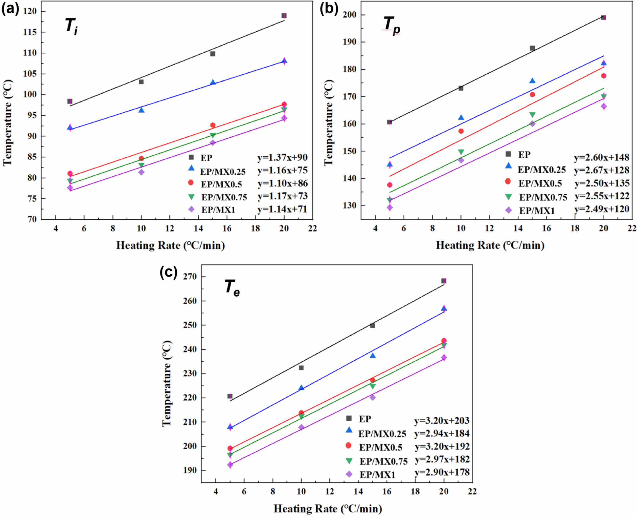 The characteristic temperature fitting results obtained from the DSC curves are shown in Figure 6. The results in Figure 6 indicate that there are also differences in the characteristic temperatures of EP/MXenes composites at different heating rates (β). The T-β extrapolation method for curing EP/MXenes composites is a differential scanning calorimetry test conducted on EP/MXenes composites at different heating rates. By analyzing the relationship between the peak temperature of the curing reaction and the heating rate, the theoretical curing reaction temperature at infinite slow heating is extrapolated to determine the optimal curing temperature. This provides an important basis for the formulation of EP/MXenes composites curing processes, research on curing kinetics, and evaluation of curing degree. Adopting T-β extrapolation method, we can obtain the characteristic temperatures when the heating rate (β) approaches 0 ℃/min based on the intercept of the fitted curve, and then roughly determine the curing process parameters of various EP/MXenes composites. The obtained characteristic temperatures include the initial curing temperature (Ti), curing peak temperature (Tp), and curing end temperature (Te) and total enthalpy are shown in Table 1. From Table 1, after adding MXenes, the various characteristic temperature values of EP/MXenes composites will decrease, and the higher the concentration of MXenes added, the greater the decrease in the above characteristic temperature values. Moreover, the total enthalpy gradually increases with the increase of MXene content, indicating that the presence of MXene makes more fractions of EP takes part in the curing process. This is consistent with the results in Figure 5.