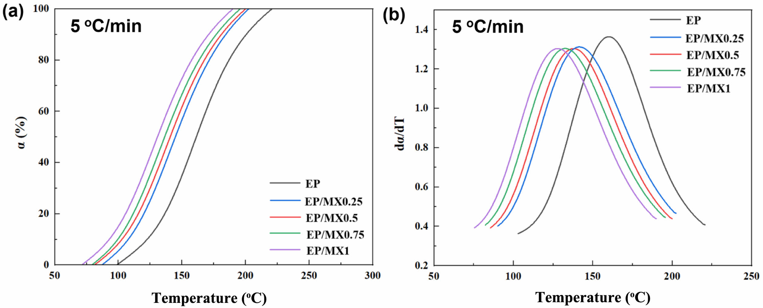 From Figure 7(b), it can be seen that for all samples, the curing rate shows an increasing trend as the temperature increases during the initial curing stage. In this stage, EP/MX1 exhibits the highest curing speed, which reaches peak curing rate at the earliest. This is because the MXenes concentration of EP/MX1 is the highest, and it can be well dispersed in the EP matrix, thus participating more fully in the curing process of EP, forming a stronger cross-linking network structure, and can end the curing reaction faster. For other samples with low MXenes addition, the curing rate actually decreases, and the temperature at which the curing rate peak is reached is also more delayed. At later curing stage, as crosslinking reaction progresses, the viscosity gradually becomes larger, and the curing speed becomes slow gradually.