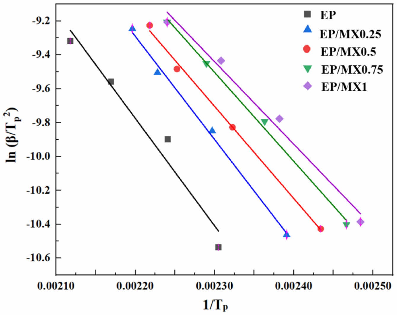 The activation energy Ea can be calculated based on the slope of ln(β/Tp2)-1/Tp. Figure 8 shows the fitted lines obtained based on this, and Table 2 shows the curing activation energy Ea of pure EP and EP/MX composites calculated using the Kissinger method. From Table 2, it can be seen that after adding various concentrations of MXenes, the Ea of EP will decrease. Among them, the Ea of EP/MX1 decreased from 52687 J/mol of pure EP to 40503 J/mol, a decrease of about 20%, indicating that the addition of MXenes has a significant promoting effect on EP curing. Moreover, after adding only 0.5 wt% MXenes, the Ea of EP/MX0.5 is found to be 45234 J/mol, indicating that EP/MX0.5 is very efficient in accelerating the curing of EP.