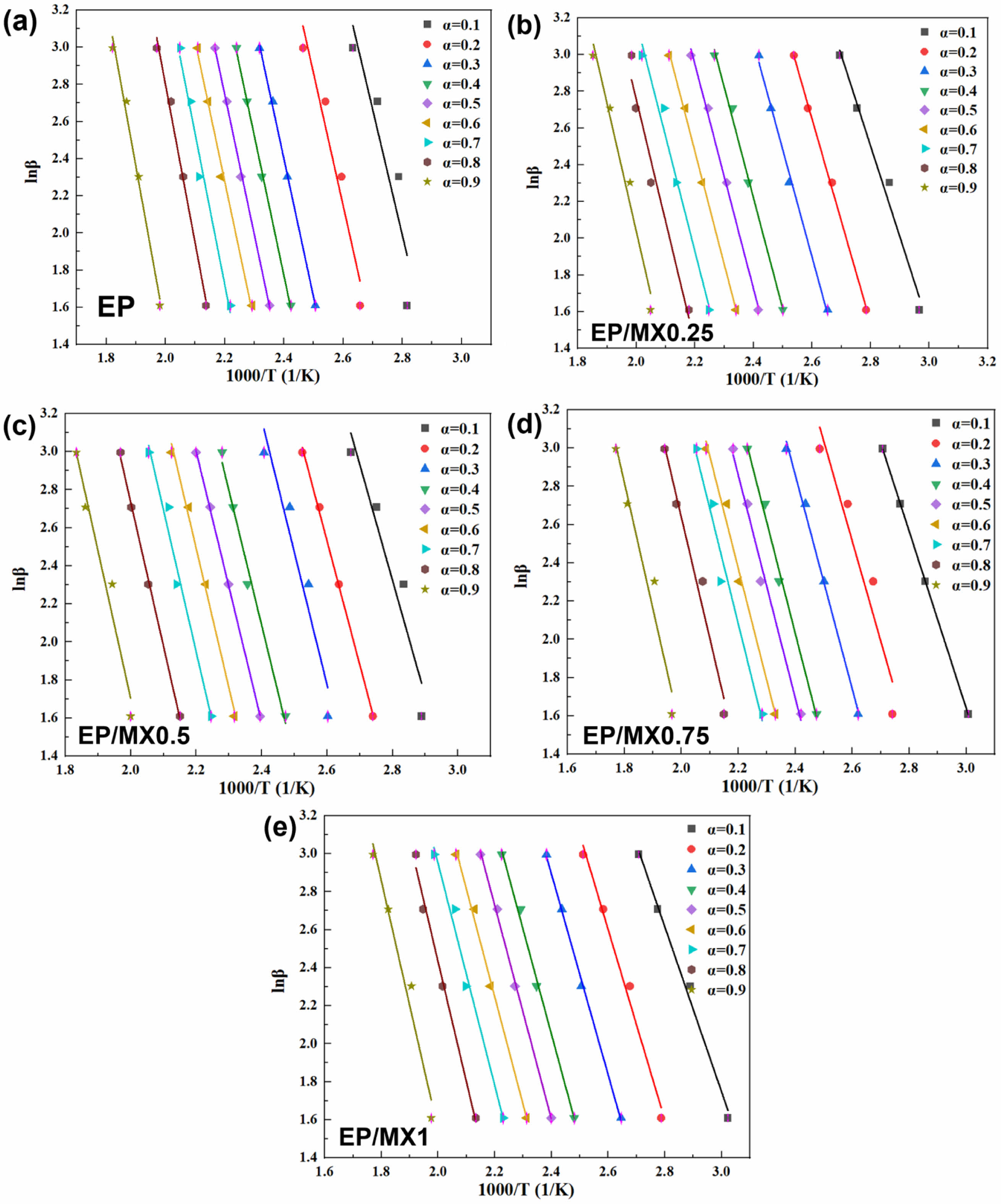 At the heating rates of 5 ℃/min, 10 ℃/min, 15 ℃/min, and 20 ℃/min, when the conversion degrees are 10, 20, 30, 40, 50, 60, 70, 80, and 90%, the lnβ-1000/T curves of EP, EP/MX0.25, EP/MX0.5, EP/MX0.75, and EP/MX1 can be seen in Figure 9. From the slopes of each fitted line in Figure 9, Ea at different conversion degrees are therefore calculated, as can be seen from Figure 10.