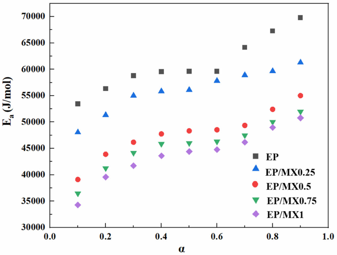 At the same conversion degree, regardless of the concentration of MXenes added, the apparent Ea of EP will decrease. The higher the concentration of MXenes, the higher the degree of decrease in apparent Ea. However, overall, when the amount of MXenes added reaches 0.5 wt%, the decrease in apparent Ea is already quite significant. Further increasing the concentration of MXenes resulted in a lower decrease in apparent Ea.