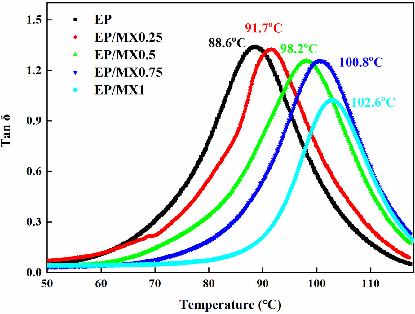 To obtain further understanding, Tg values of the samples were measured by DMA, the obtained tanδ curves of the samples were shown in Figure 11. The Tg values were marked in the figure as well. It can be seen that after adding MXenes, the Tg value of the samples increases gradually with the increase of the MXenes content, which might indicate that the presence of MXenes promotes the crosslinking of EP.