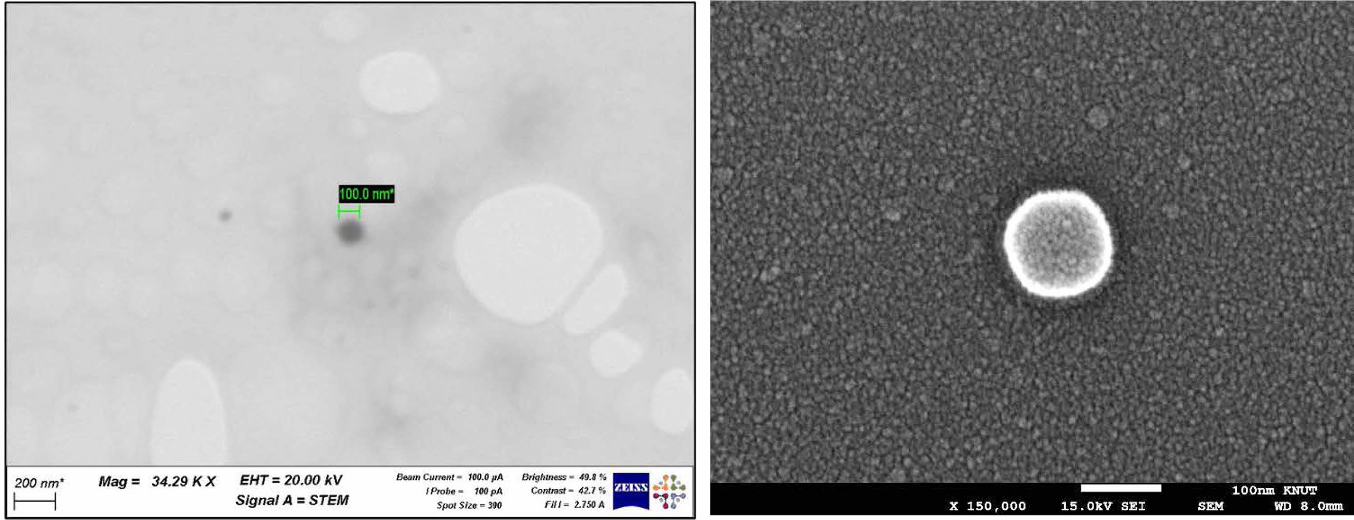 Figure 3 (a) Scanning transmission electron microscopy (STEM); (b) SEM images of L-CisTCA liposome. |