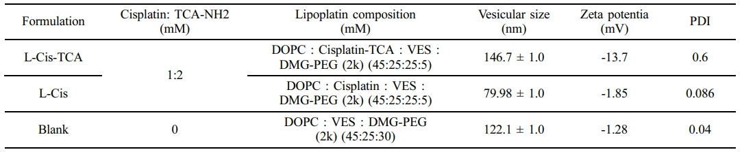 The entrapment efficiencies and vesicular size were methodically listed for different liposomes presented in Table 1 and 2. The entrapment efficiency of L-CisTCA was 94% near to L-Cis that was 97% (Table 1); although 0.34 mg and 0.12 mg of cisplatin was loaded per mg of lipid in L-CisTCA and L-Cis respectively.