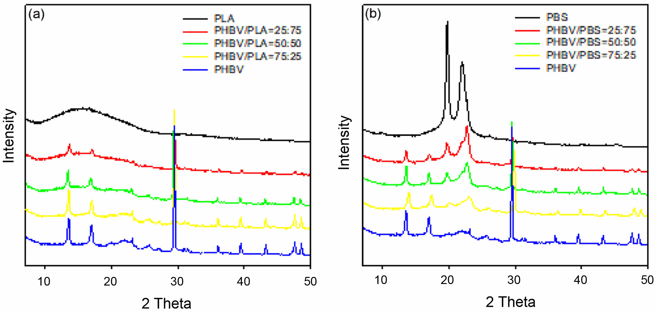 Figure 6 Wide angle X-ray diffraction (WAXD) of (a) PHBV/PLA; (b) PHBV/PBS. |