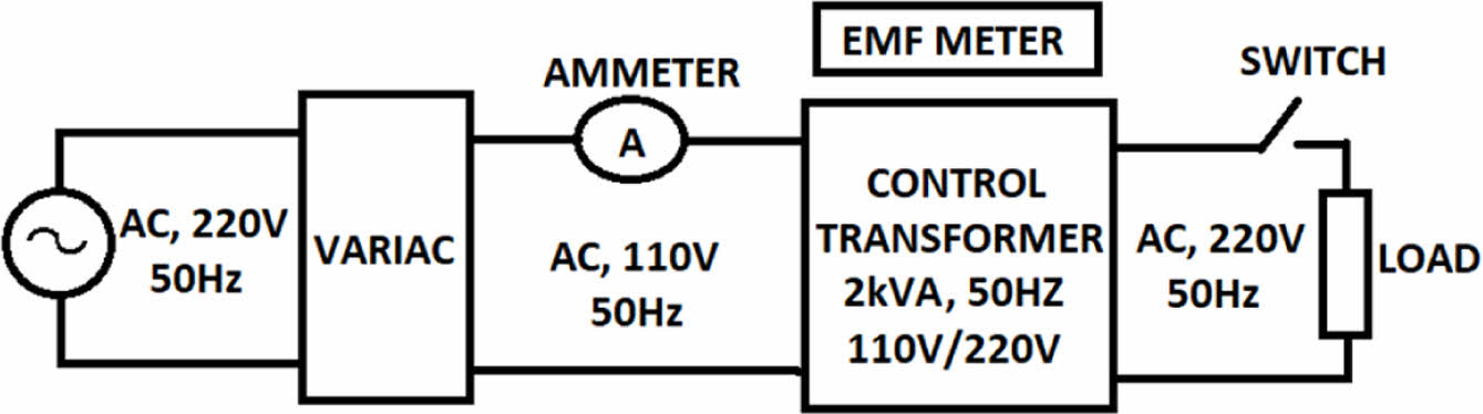The symbol E represents the electric potential difference, denoted in volts (V). The symbol S represents the size of the cross-section, N represents the number of turns in the windings, and f represents the frequency, measured in hertz (Hz). This study used a 2 kVA, 110V/220V, 50 Hz control transformer to monitor EMF. A 7.5 kVA variac (autotransformer) with adjustable output ranging from 0 to 220 V is used to provide primary transformers. Figure 5 depicts the schematic diagram of the experimental configuration.