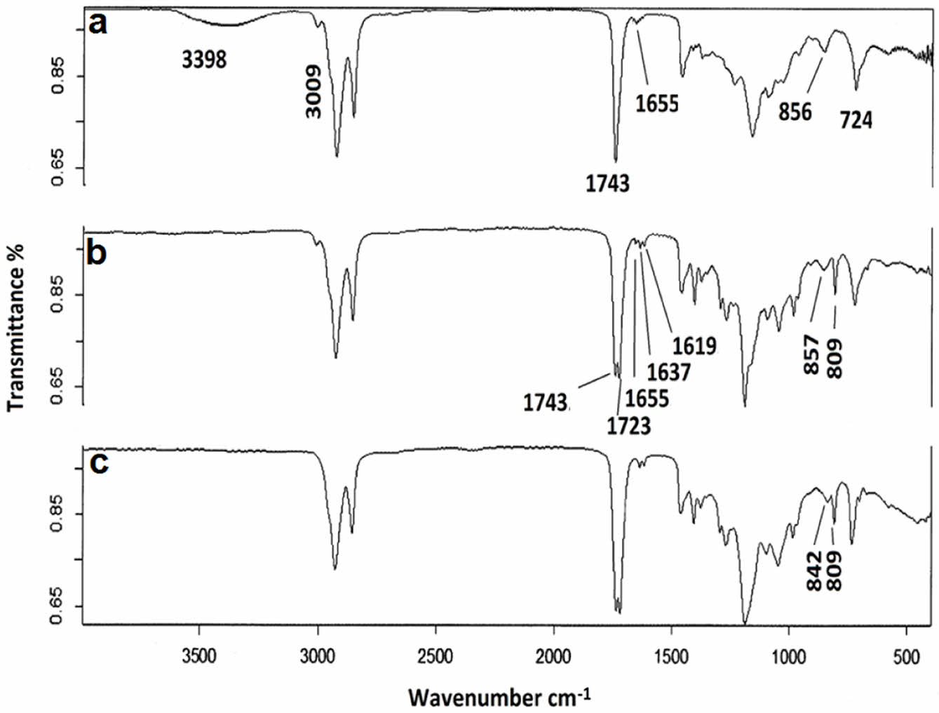Figure 7 FTIR spectrum of a-castor oil, b-acrylated castor oil and c-epoxidized acrylated castor oil. |