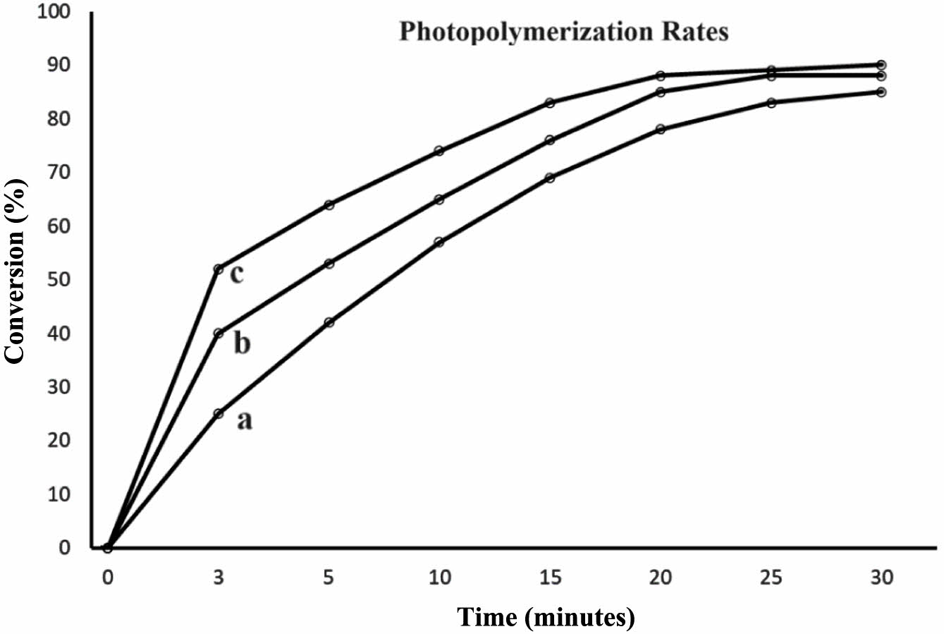 Figure 12 Photopolymerization rates of bio-based epoxy resin with a-0.5% photoinitiator, b-1% photoinitiator, a-3% photoinitiator. |