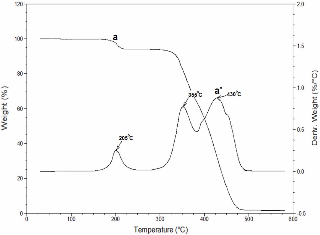 Figure 13 TGA thermogram: (a) and derivative TGA curves (a’) of bio-based epoxy paint matrix. |