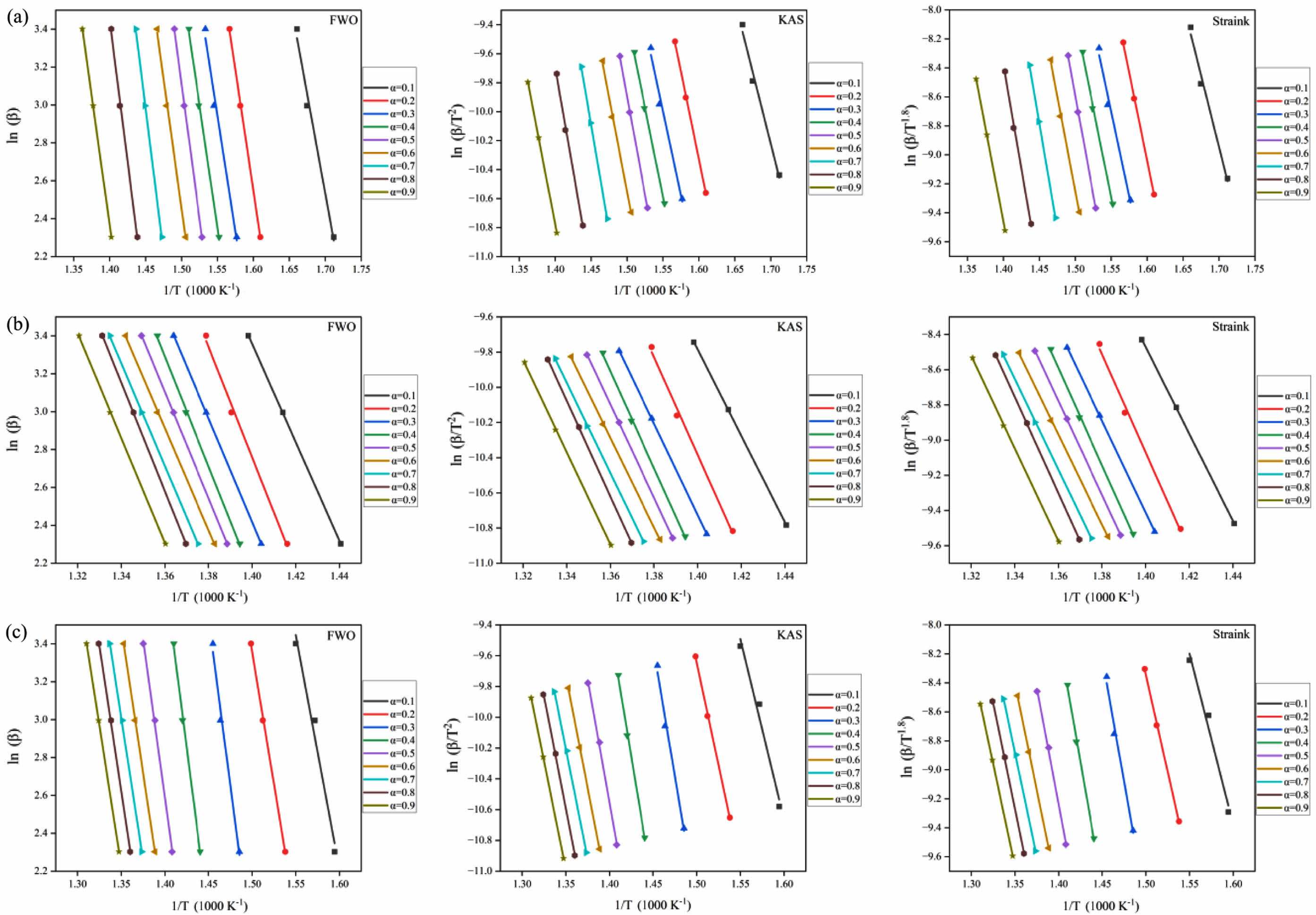 Equations (6) to (8) utilize 1/T as the horizontal axis, while ln(β), ln(β/T 2), and ln(β/T1.8) are employed as the vertical axes for the purpose of curve fitting. The slopes of these fitted curves are then analyzed to estimate the activation energy (Eα) at various conversion rates.