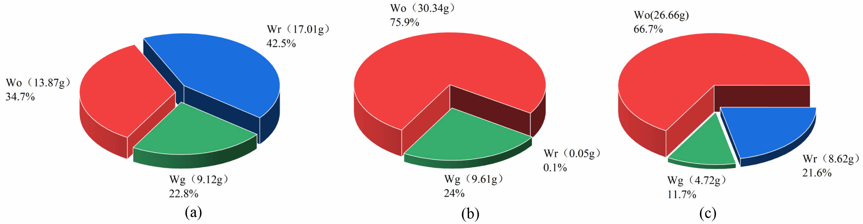 Figure 5 The composition ratio of pyrolysis products: WPp (a); WTs (b) and WTs/WPp. Note: Wz represents total mass, Wo represents quality of pyrolysis oil, Wr represents quality of pyrolysi residue, Wg represents quality of pyrolysis gas. |
