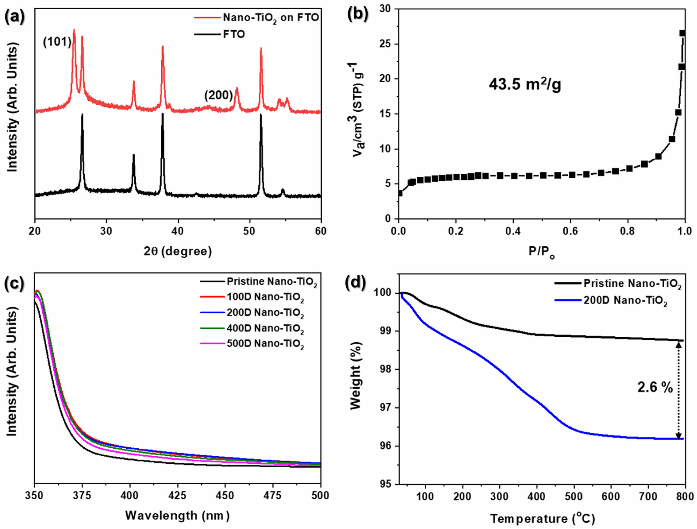 Figure 3 (a) XRD pattern; (b) BET analysis for TiO2 electrode; (c) UV-vis spectra for PANi/phytic acid on nano-TiO2; (d) thermal gravimetric analysis (TGA) of pristine and 200D Nano-TiO2. |
