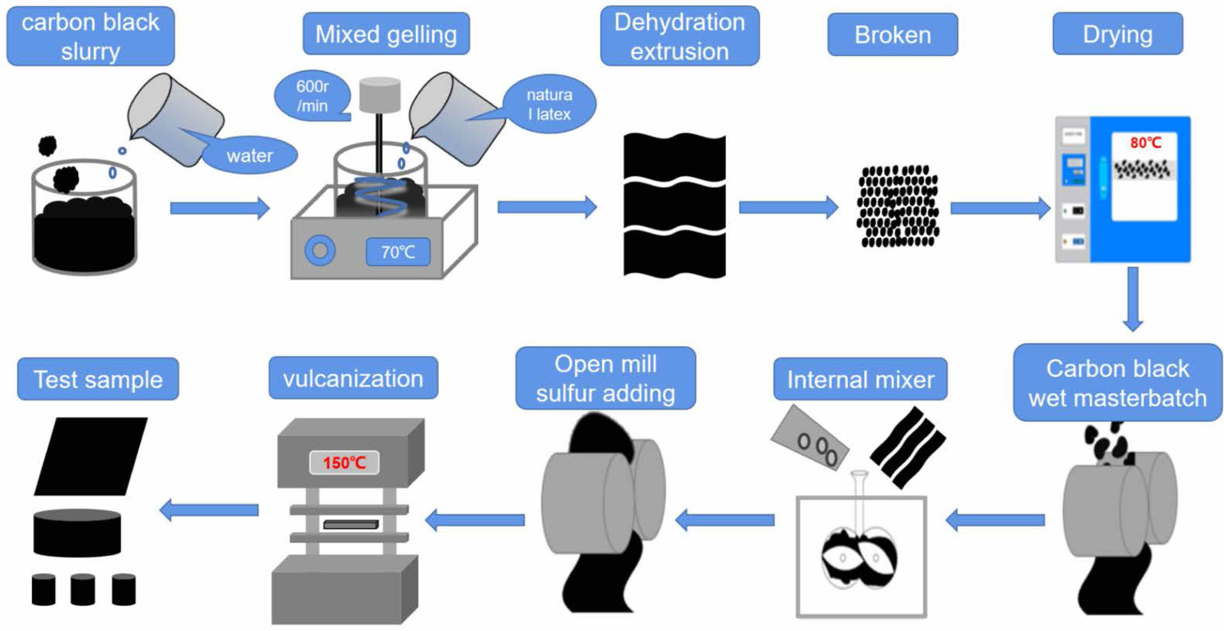 Wet mixing process: The carbon black masterbatch was introduced into the internal mixer, and the ram was released. After 1 minute of initial mixing, zinc oxide (ZnO), antioxidant 4020, and stearic acid (SA) were added. At 4 min, the temperature of the compound reached 145 ℃, at which point the compound was discharged. The total mixing time was 5 min. Subsequently, the compound was transferred to a two-roll open mill, where sulfur and accelerator NS were incorporated. The rubber compound was then vulcanized at 150 ℃ under a pressure of 11 MPa for a duration of 1.3×T90 to obtain the vulcanized rubber. The experimental process is shown in Figure 1.