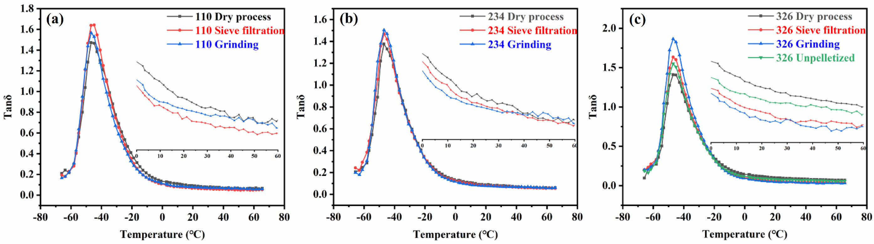 From Figure 6(c), it can be observed that the glass transition temperatures of the dry process and each wet process remained nearly unchanged. In terms of the peak tan δ, the dry-process sample exhibited the lowest peak, while the carbon black grinding wet-process sample showed the highest. The reason for this is that the dispersion of carbon black in the N326 grinding wet process resulted in a weaker filler–filler network and less carbon black agglomeration, thereby leading to a higher energy dissipation peak. The figure also reflects the anti-slip and rolling resistance performance of the vulcanized rubber. The dry process exhibited better wet skid resistance but higher rolling resistance. Among all samples, the grinding wet-process sample had the lowest rolling resistance and lower heat build-up.