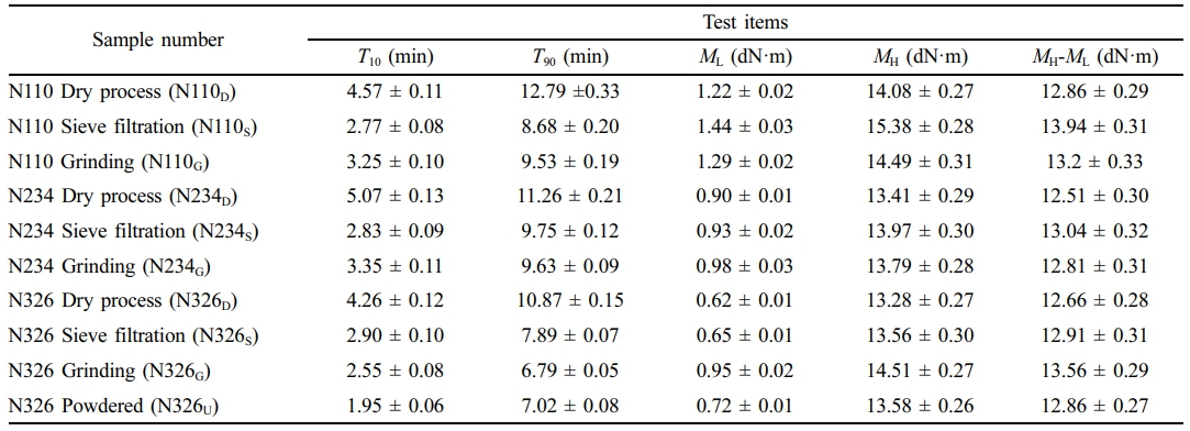 In comparison, N326 that was sieving filtration showed no significant reduction in particle size, and its MH–ML value was lower than that of the ground sample. Meanwhile, the powdered N326 sample, due to its extremely low density and poor dispersibility, resulted in uneven carbon black distribution within the rubber matrix, leading to the lowest MH–ML value among the samples studied.
