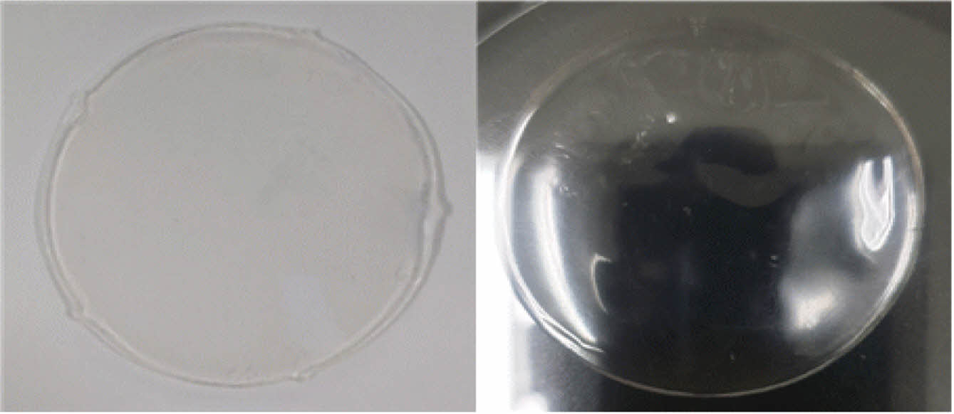 Morphology of 2-HEMA Polymer Films. Figure 1 shows the results of synthesizing 2-HEMA, EGDMA, MA, and AIBN into film form. During the film manufacturing process, depending on the properties of the mold, the 2-HEMA polymer became integrated with the mold during the curing process. As a result, an ideal 2-HEMA polymer film was obtained when a silicone mold was used. Figure 1 illustrates the morphology of the 2-HEMA polymer film before and after hydration.