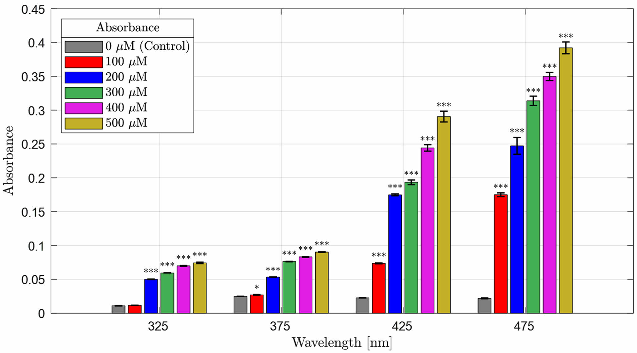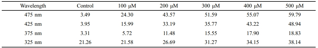 Absorbance Distribution and Absorption Rate of Beta-Carotene-containing 2-HEMA Polymer Films According to Molar Concentration Content. Figure 2 and Figure 3 show the absorbance distribution and statistical significance evaluation results of beta-carotene-containing 2-HEMA polymer films according to molar concentration ratios. Table 4 shows the absorption rate results calculated using the Lambert-Beer law. The distribution results indicate that the beta-carotene-containing films exhibited absorbance capability across the entire blue light spectrum, with the highest absorbance observed in the 450 nm to 500 nm range. The absorbance of the control group, which did not contain beta-carotene, was minimal in the 300 nm range. The absorption rate was over 43% at concentrations above 200 μM in the 475 nm range and over 43% at concentrations above 400 μM in the 425 nm range. The statistical significance evaluation of the molar concentrations showed a significant difference of 99.999% across the entire blue light spectrum at concentrations above 200 μM, and a significant difference of 95% in the 375 nm range at a 100 μM concentration. No significant difference was observed in the 325 nm range.