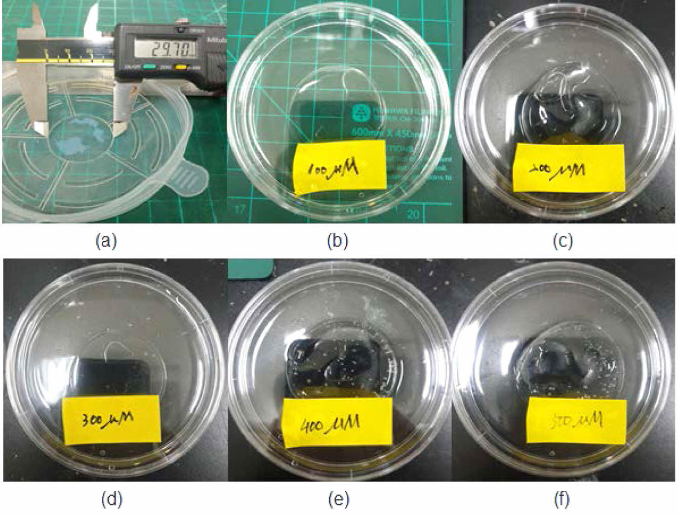After the production of 2-HEMA polymer film according to molarity: (a) film mold; (b) 100 μM; (c) 200 μM; (d) 300 μM; (e) 400 μM; (f) 500 μM, Size: 3π, Thickness: 0.102 ± 0.02 mm.