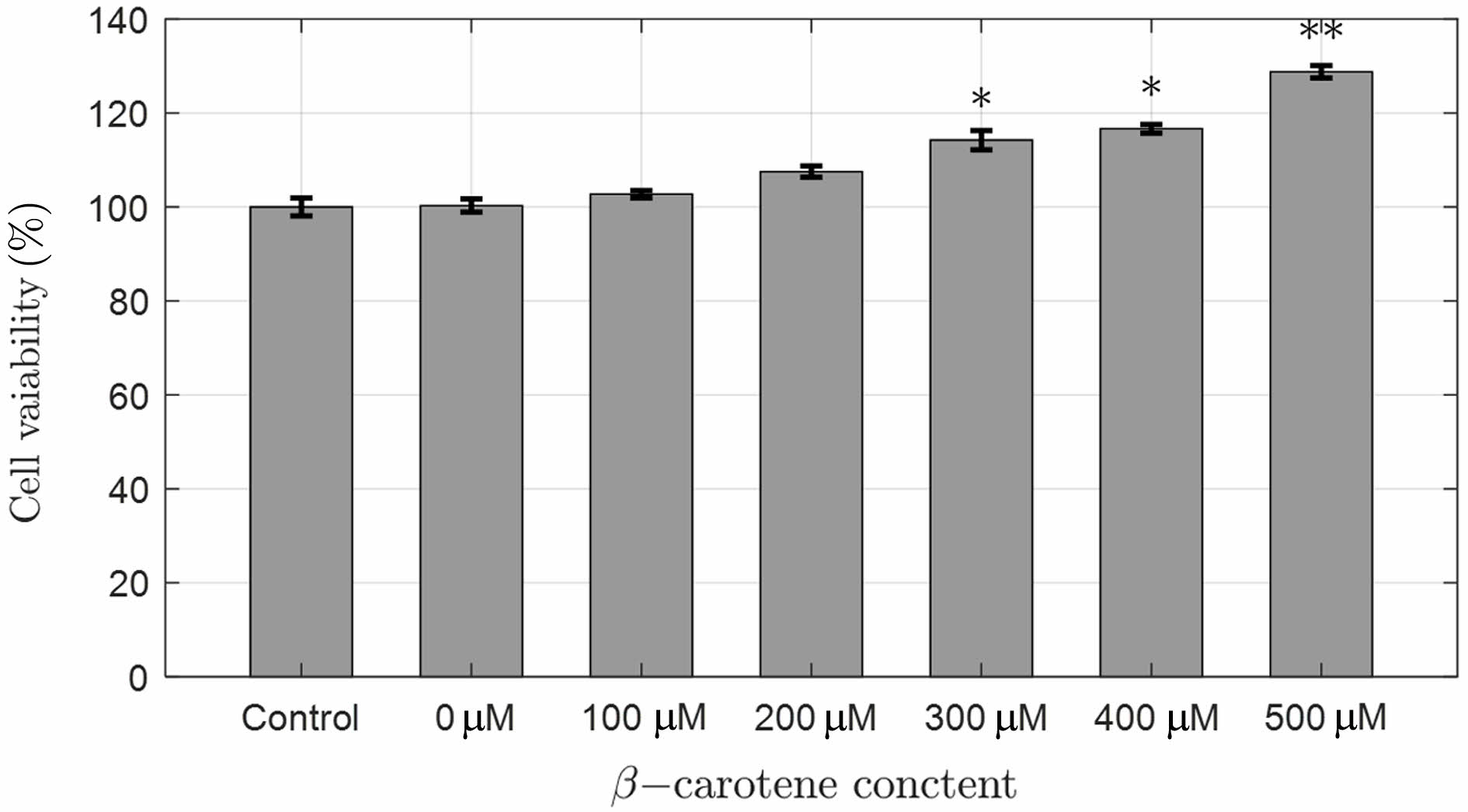Cytotoxicity of 2-HEMA polymer film containing beta-carotene according to molarity (n = 4), (**p < 0.01), (*p < 0.05).