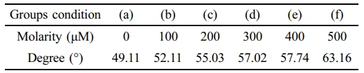 Results of contact angle of 2-HEMA polymer film containing beta-carotene ratio: (a) control (0 μM); (b) 100 μM; (c) 200 μM; (d) 300 μM; (e) 400 μM; (f) 500 μM.