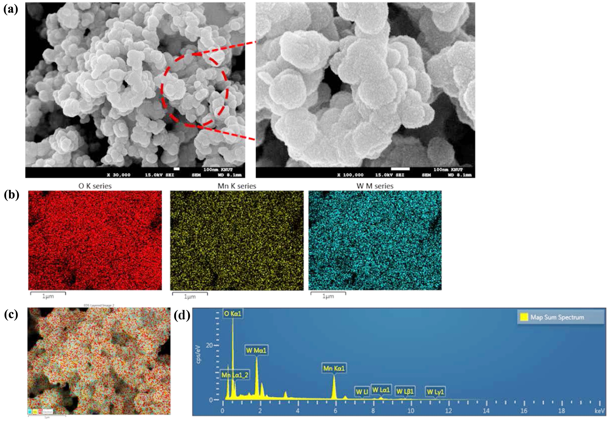 Figure 2 (a) FESEM of W-MNF-0.3060 at different magnification level; (b) EDS mapping of different atoms; (c) merged image; (d) EDS analysis. |