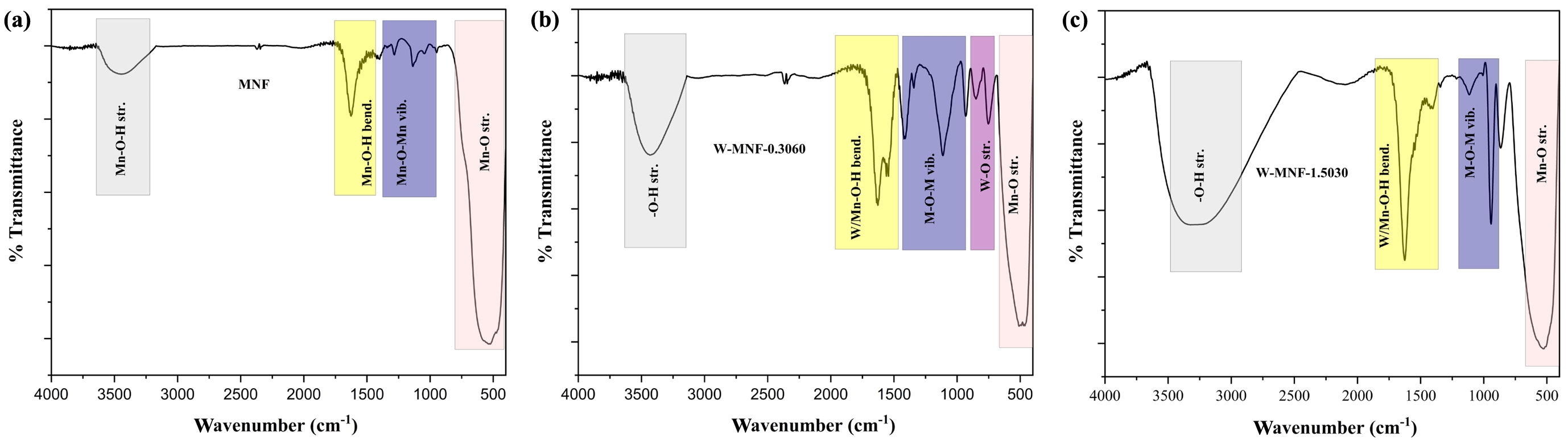 and in both cases the Mn-O stretching is observed around 500 cm-1, but due to the presence of tungsten in the moiety, the later one showed a little downshift (Figure 5). The FTIR spectrum of W-MNF-1.5030 exhibits similar characteristic shifts as observed in W-MNF-0.3060; however, a notable difference is the absence of the W–O stretching vibration in W-MNF-1.5030, which is distinctly present in W-MNF-0.3060. This absence may indicate a different mode of tungsten incorporation at higher doping levels, possibly due to lattice saturation or a shift from terminal W–O bonding to more delocalized W–O–Mn or W–O–W bridging environments. Such structural variations could lead to diminished IR activity for the W–O stretching mode, thereby explaining its disappearance in the higher-doped sample.