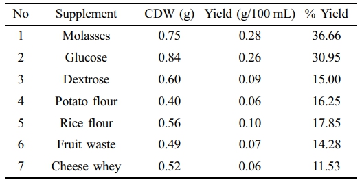 Comparison of the two medium showed that NB supplemented with different supplements have produced higher yields compared to those in MSM.