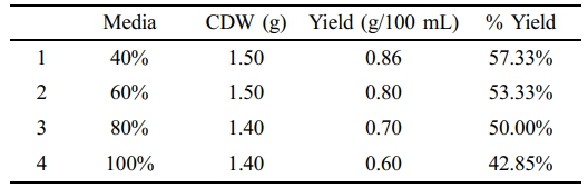 Pre hydrolyzed wasted potato was synthesized and used with NB (40, 60, 80, and 100%) supplemented with 300 µL of wasted edible oil. 40, 35.71, 34.78, and 33.33% PHA production were calculated at 40, 60, 80, and 100% of pre hydrolyzed media respectively. Calculations revealed minimal variation in percentage yields across various hydrolyzed medium and NB concentrations (Table 7).