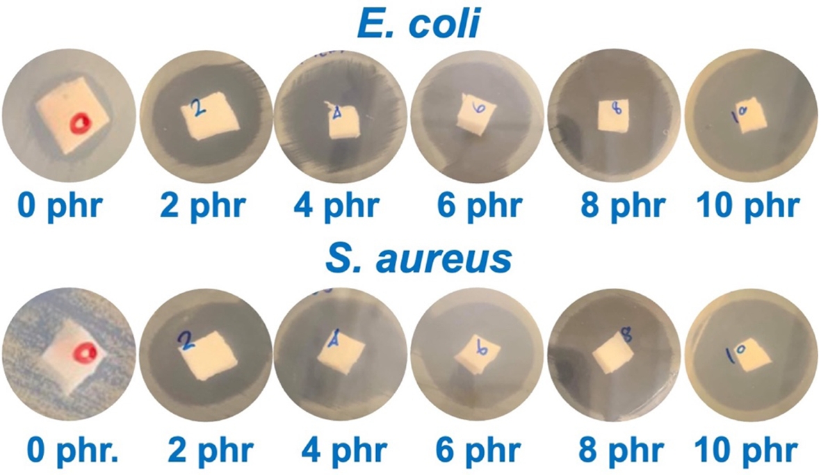 Various antibacterial agents have been used in NR and other polymers, including silver (Ag) nanoparticles,9,10 chitosan,11,12 essential oils,13 and to name a few. Each has notable strengths and drawbacks. Ag nanoparticles exhibit strong antimicrobial activity but suffer from high cost, cytotoxicity concerns, and agglomeration issues that hinder uniform performance. Chitosan is biodegradable and biocompatible; however, its hydrophilicity reduces compatibility with NR and limits its long-term effectiveness. Essential oils are sustainable and broadly antimicrobial, but their volatility, thermal instability, and odor restrict practical use in NR processing. The primary considerations for using biocides in materials are high compatibility, long-term stability, and tolerance under processing conditions.