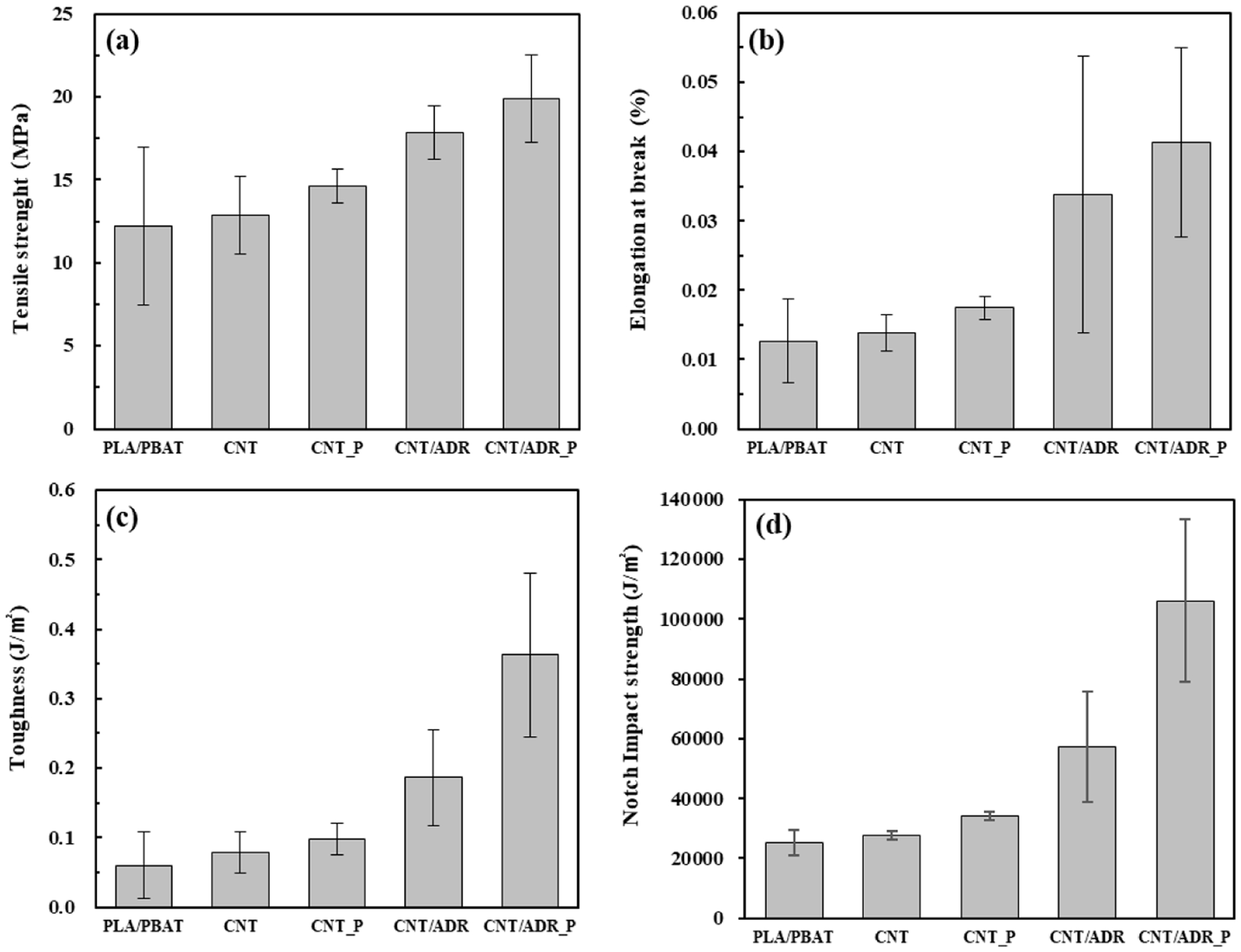 CNT와 상용화제인 ADR이 PLA/PBAT 기반 복합소재의 기계적 특성에 미치는 영향은 Figure 9에 나타내었다. 고분자 블랜드에서 두 수지 간의 비상용성은 물성 저하를 초래한다. PLA/PBAT 블랜드의 경우, 두 고분자 사이에 낮은 호환성과 계면 접착력으로 가장 낮은 기계적 물성을 보인다. PLA/PBAT 블랜드에 CNT를 첨가하게 되면 고강도 CNT의 강화 효과로 인하여 기계적 물성이 약간 증가하게 된다. 특히, CNT와 ADR을 모두 첨가하면 파단 연신율, 강인성, 충격강도는 1.5~2배 이상 증가한다. 이는 높은 연성을 가지는 PBAT와 PLA의 상용성 증가와 고강도 섬유의 강화 효과 때문에 나타나는 결과이다.13 유변학적 특성 분석 결과 ADR을 첨가하면 PLA-PBAT 공중합체가 형성되어 점도가 크게 증가한다. 또한, 모폴로지 특성 분석 결과 ADR을 첨가하는 경우 상용성 증가로 인해 분산 상의 크기가 감소하였다. 이를 통해 기계적 특성의 결과를 뒷받침할 수 있다. 결론적으로, ADR 첨가로 PLA와 PBAT의 상용성이 증가하여 PLA의 취성이 개선되고, 재료의 내충격성이 향상됨을 알 수 있다.13